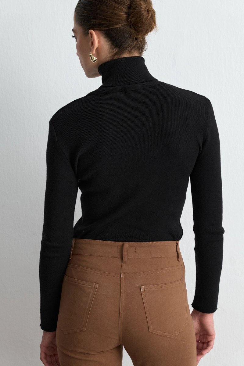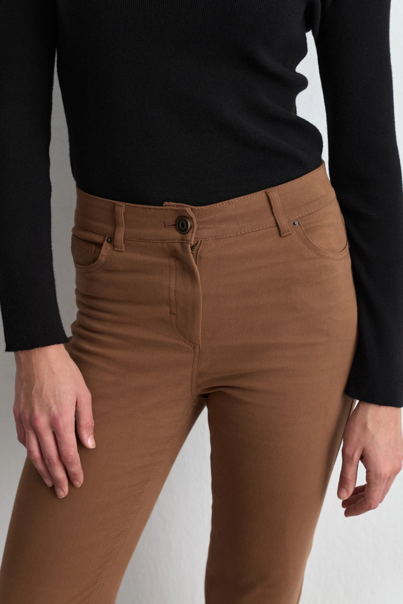 The camel tone provides a warm and natural look. The canvas fabric offers durable and comfortable wear. The five-pocket design provides practical style. The straight cut creates minimalist elegance. It is an ideal piece for daily and urban outfits.