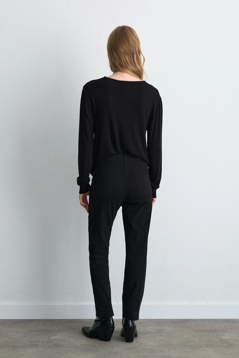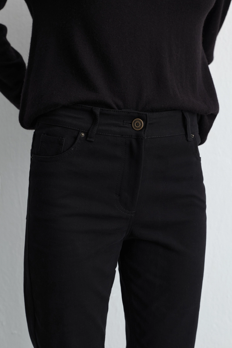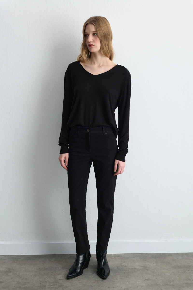 The black color offers a classic style that matches any outfit. The canvas fabric provides durability and comfort. The five-pocket design adds a modern and functional detail. The straight cut offers minimalist elegance. It is a comfortable and stylish choice for daily wear.