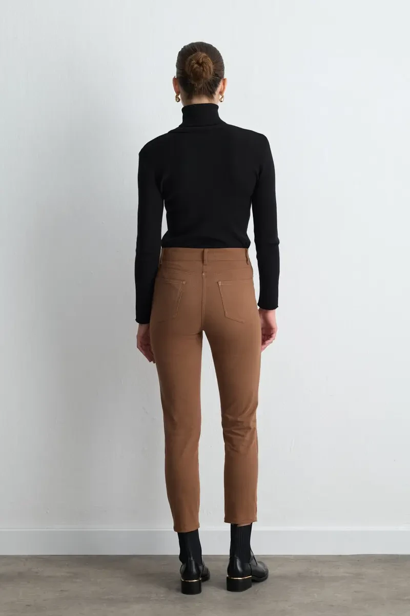 The camel tone provides a warm and natural look. The canvas fabric offers durable and comfortable wear. The five-pocket design provides practical style. The straight cut creates minimalist elegance. It is an ideal piece for daily and urban outfits.