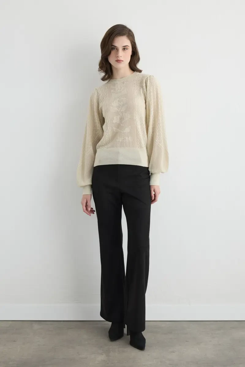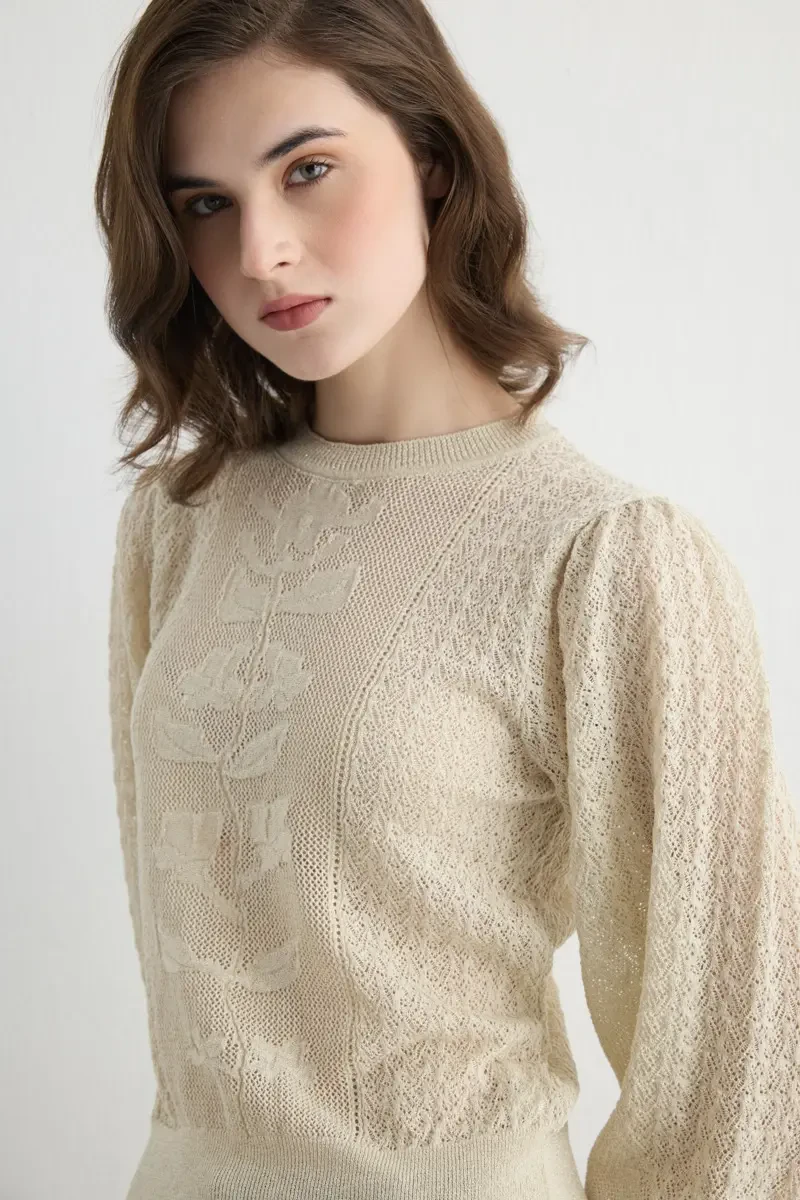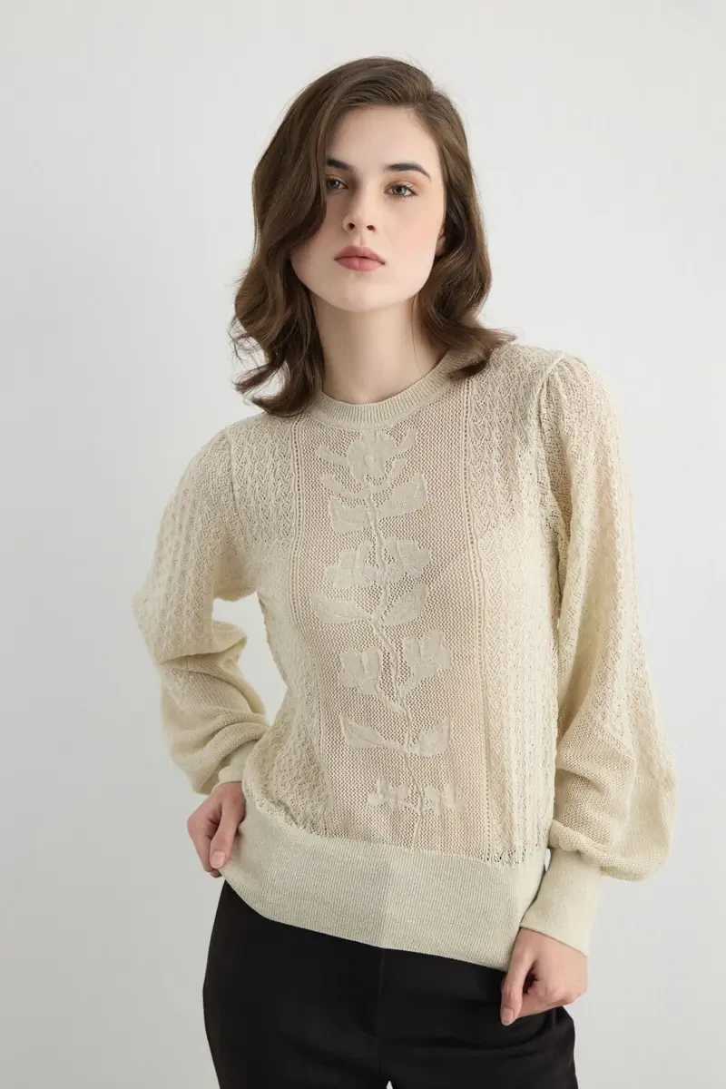 Yumuşak bej rengi sıcak ve sofistike bir etki yaratıyor. Ajur detaylar ve balon kollar feminen bir hava katıyor. Triko dokusu rahatlık ve kullanım kolaylığı sağlıyor. Günlük kombinlerde şıklığı artırıyor. Alt parçalarla uyumlu bir bütünlük yakalanıyor. Zarif tonları her mevsime uygun bir stil sunuyor.