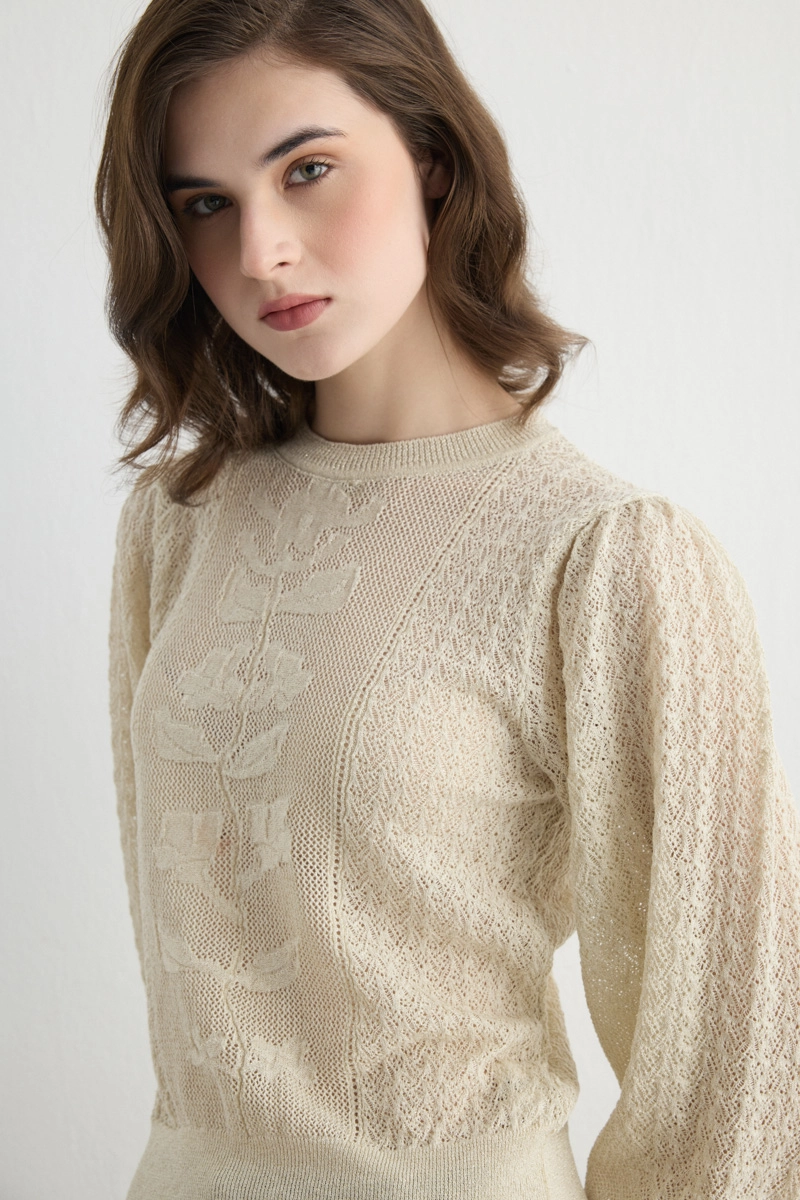 Soft beige creates a warm and sophisticated effect. Openwork details and balloon sleeves add a feminine touch. Knit fabric provides comfort and ease of wear. Enhances elegance in daily outfits. Creates a harmonious look with coordinating bottoms. Refined tones offer a versatile style suitable for any season.