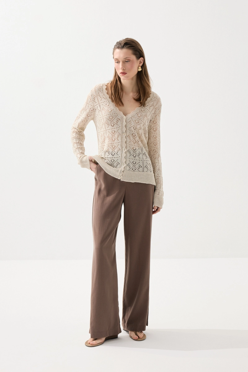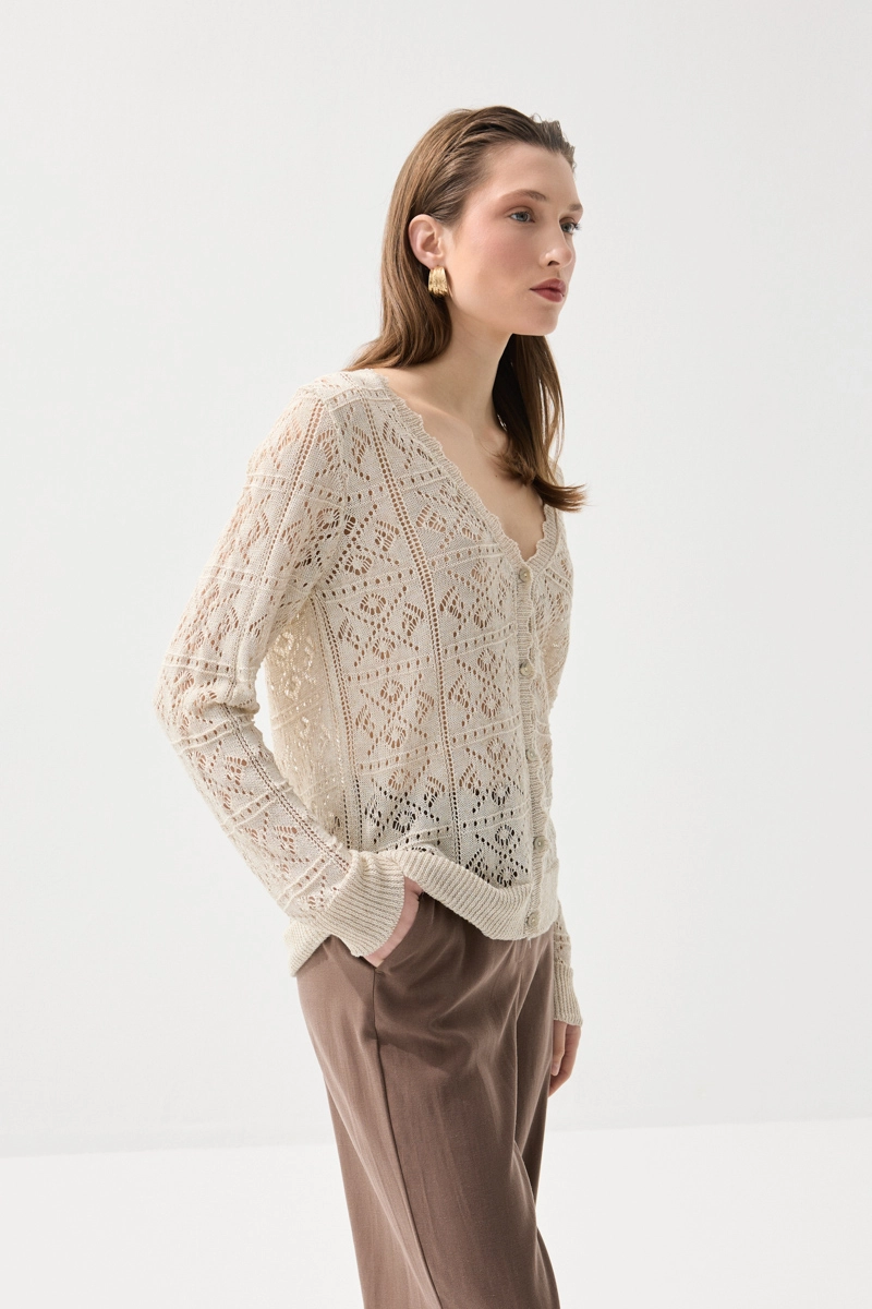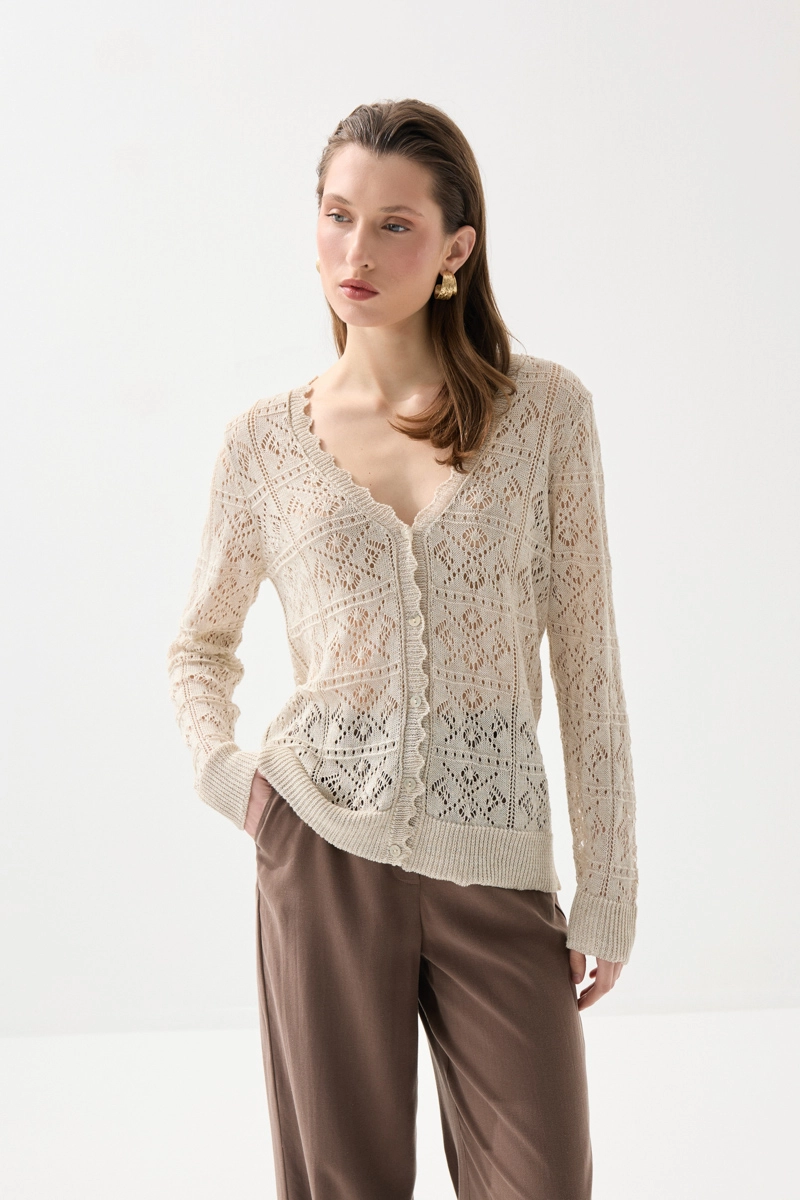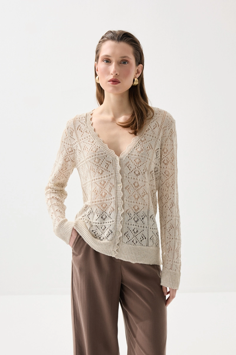 Ajurlu triko dokusuyla zarif ve şık bir görünüm sunan bu kısa kollu hırka, hafif yapısıyla konforlu bir kullanım sağlar. Nefes alabilen yapısı sayesinde gün boyu ferahlık sunar. Katmanlı kombinler için ideal olan bu parça, hem günlük hem de şık stillere uyum sağlar. Yumuşak dokusu ile ciltte hoş bir his bırakır. Gardırobunuzun tamamlayıcı parçalarından biri olmaya adaydır.