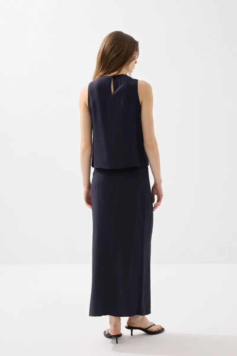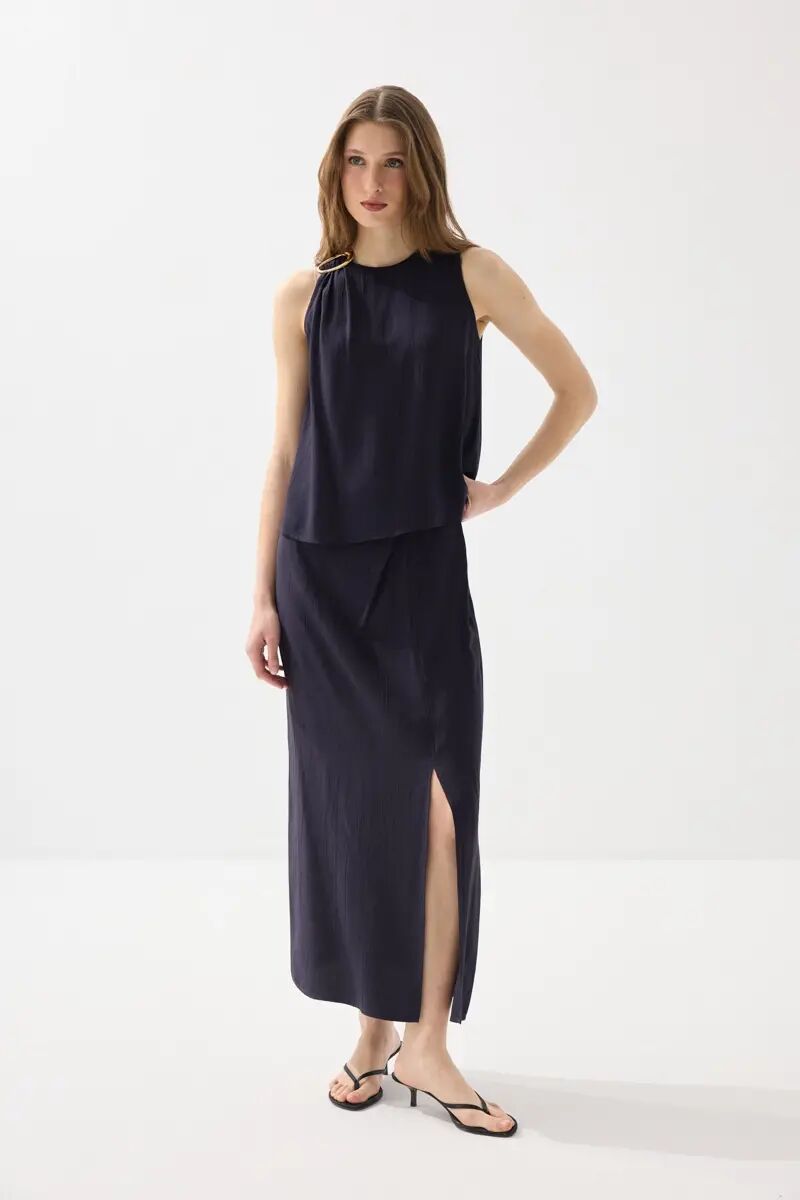 Aksesuarlı Kolsuz Bluz & Yandan Tokalı Uzun Yırtmaçlı Etek - Lacivert