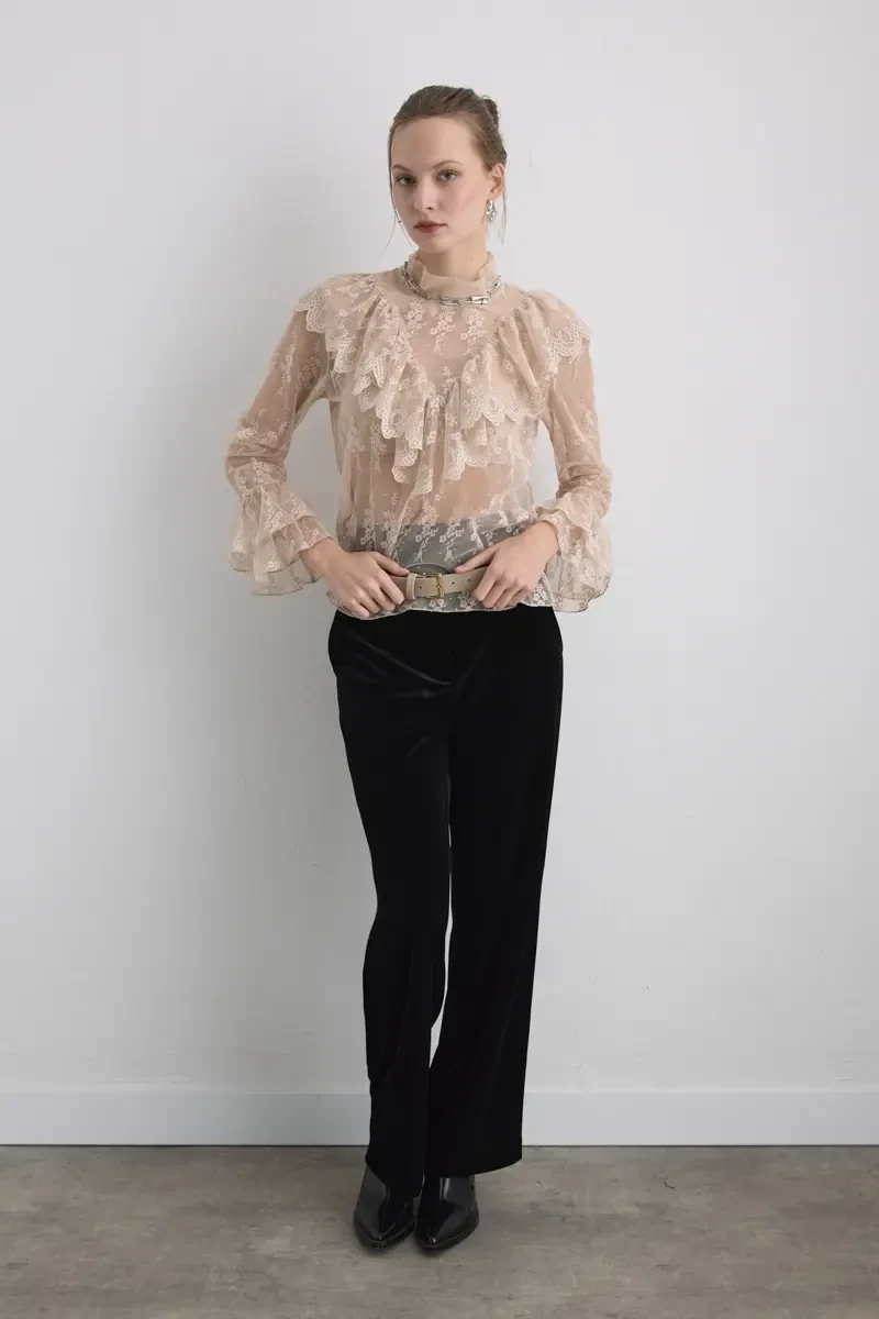 Fine lacework offers a romantic look. The beige tone creates a soft and elegant effect, while its lightweight texture ensures comfort. Easily paired with skirts, trousers, or jackets.