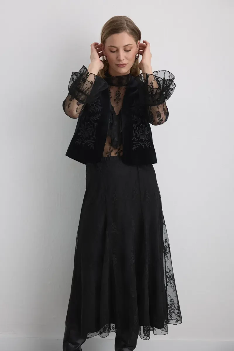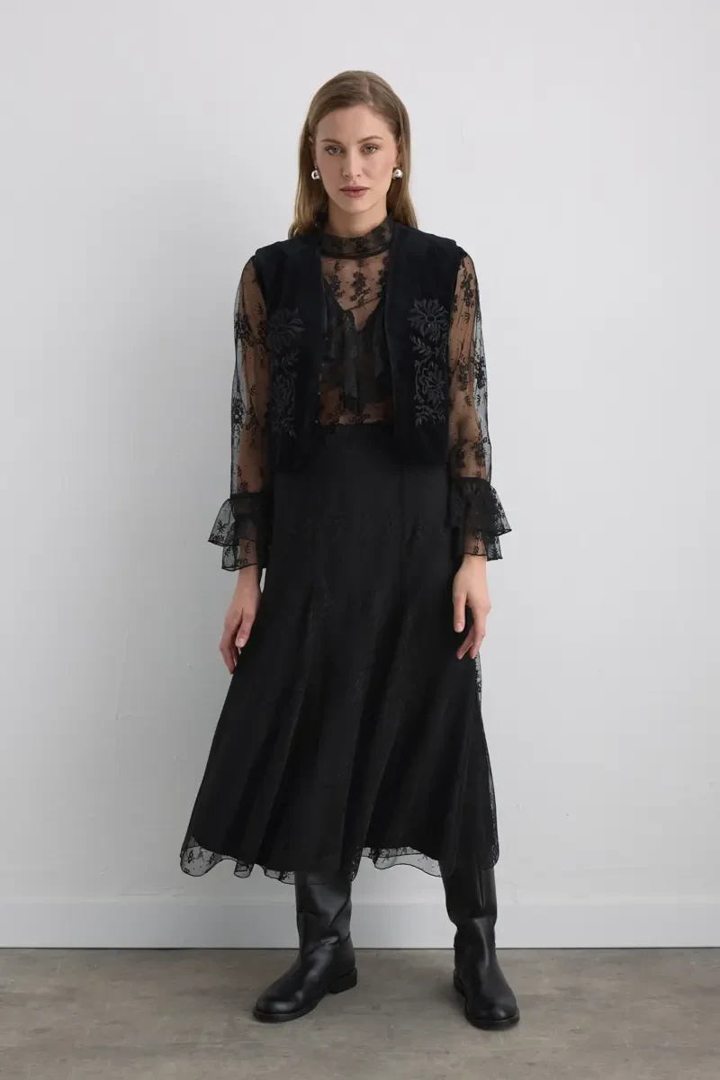 The delicate lace texture adds a feminine touch. Its long form creates an elegant silhouette, and the inner lining ensures comfortable wear. Suitable for styles from everyday chic to special event outfits.
