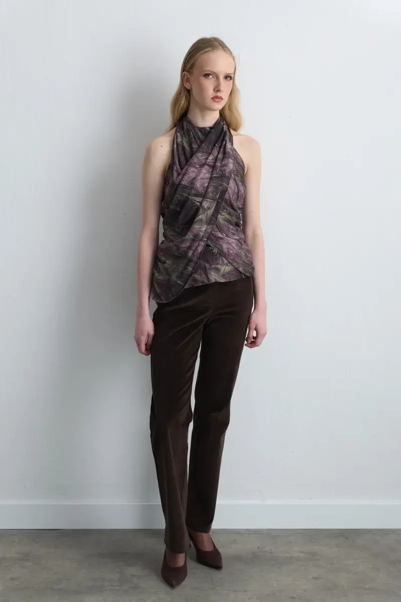 This plum blouse, highlighted by scarf detail and halter neck design, offers a feminine and modern appearance. Suitable for various occasions from casual elegance to special events. Its refined texture and vibrant color add a sophisticated touch to your style.
