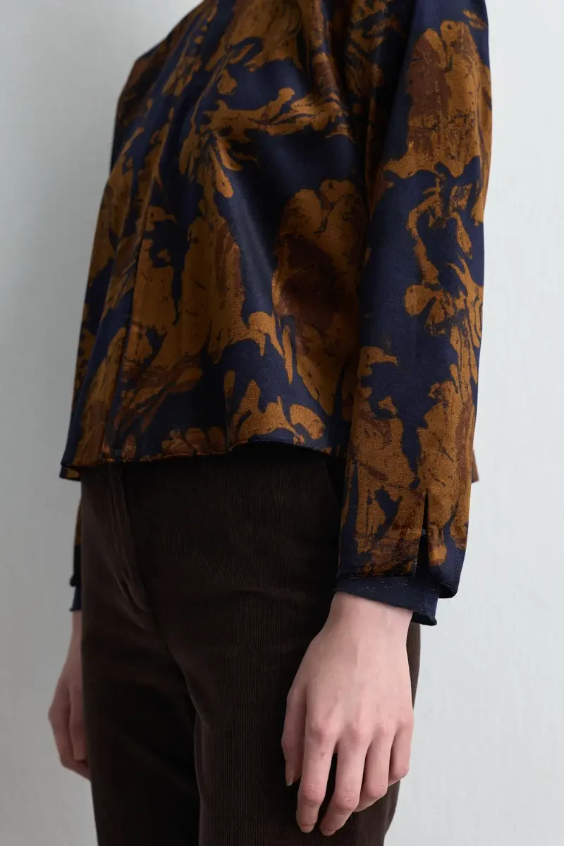 The velvet fabric provides a luxurious and elegant look. The navy tone adds sophistication and nobility. The stand collar detail creates modern minimal elegance. The straight cut suits daily and special outfits. Stands out as a complement to city style.