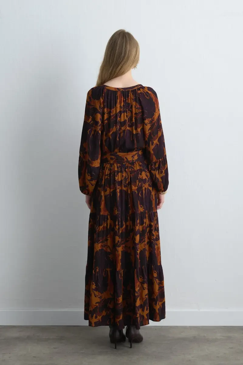 Akıcı viskon kumaşı ve zarif kemer detayıyla öne çıkan bu elbise, mürdüm renginin sofistike etkisini taşır. Uzun boyu sayesinde feminen bir siluet oluştururken rahat kesimiyle gün boyu konfor sunar. Hem gündüz hem akşam davetlerinde tercih edilebilecek şık bir parçadır. Çizme, topuklu veya zarif sandaletlerle kombinlenerek farklı stiller yaratılabilir.