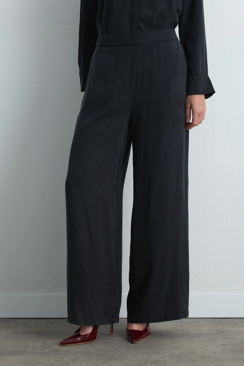 Bol kesimiyle rahat bir silüet sunar. Siyah tonu kombinlerde sofistike bir denge oluşturur. Lyocell kumaşı nefes alabilen yapısıyla konfor sağlar. Blazer ceketlerle tamamlandığında güçlü bir görünüm ortaya çıkar.