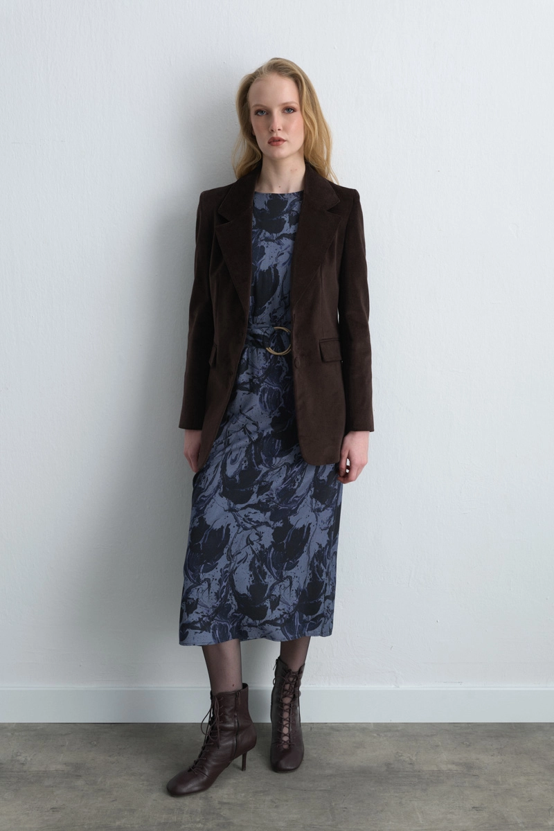 Lacivert zemin üzerinde canlı desenleriyle öne çıkan bu elbise, viskon dokusuyla hafif ve rahat bir kullanım sunar. Bel veya etek kısmındaki kesimler, feminen bir siluet yaratır. Hem gündüz hem de özel davet kombinlerinde rahatlıkla tercih edilebilir. Farklı aksesuarlarla stilinizi tamamlayarak modern ve zarif bir görünüm elde edebilirsiniz. Şıklığı ve konforu bir araya getiren zamansız bir parçadır.