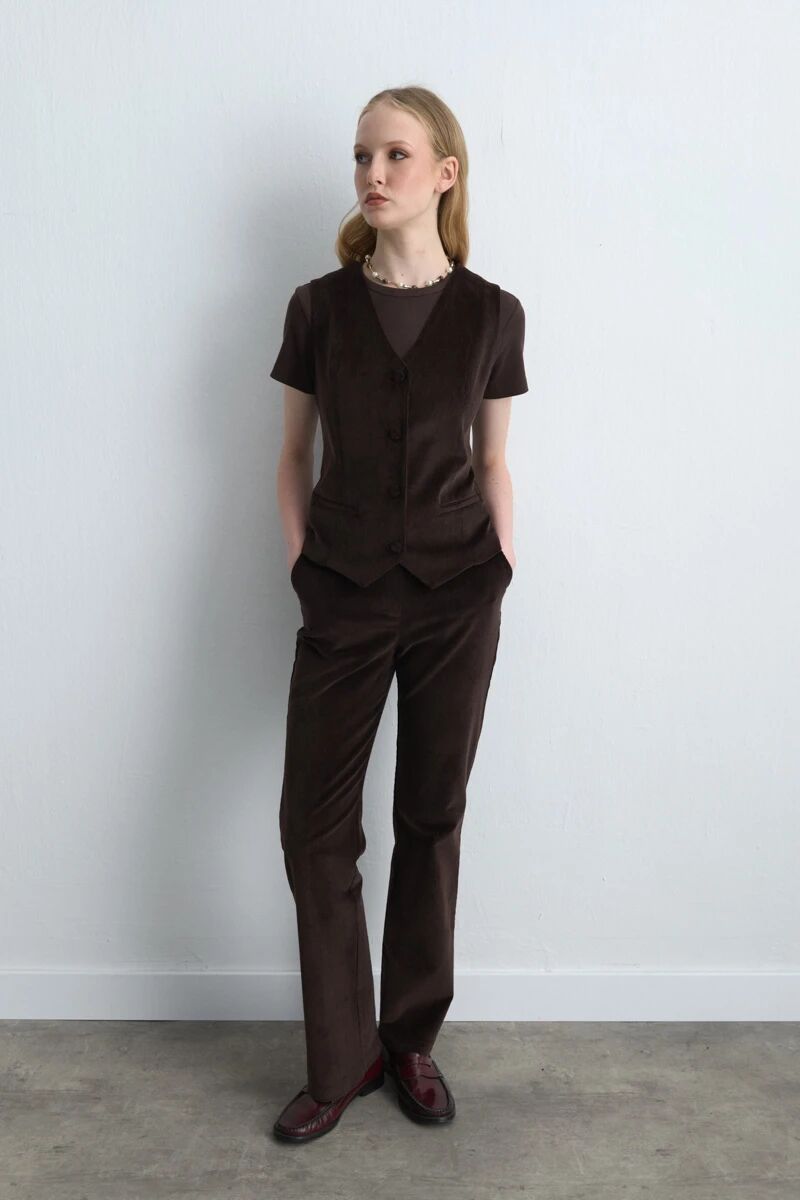 Anka Koleksiyonu Fitilli Kadife Boru Paça Pantolon - Kahverengi