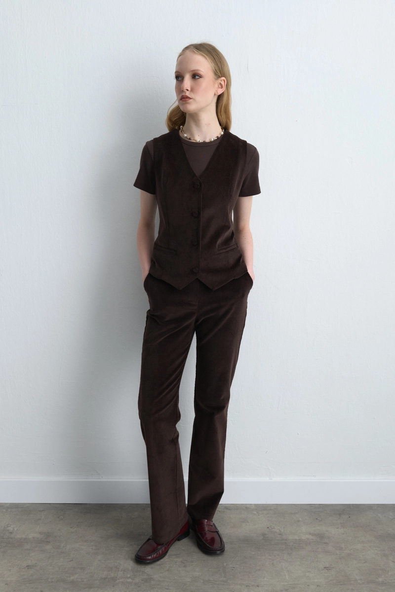 Sıcak kahverengi tonuyla öne çıkan bu fitilli kadife yelek, hem günlük kombinlerde hem de ofis stilinde rahatlıkla tercih edilebilir. Yumuşak dokusu ve şık formu sayesinde katmanlı giyimin vazgeçilmez parçalarından biridir. Zamansız tasarımıyla dolabınızda uzun süre yer bulur.