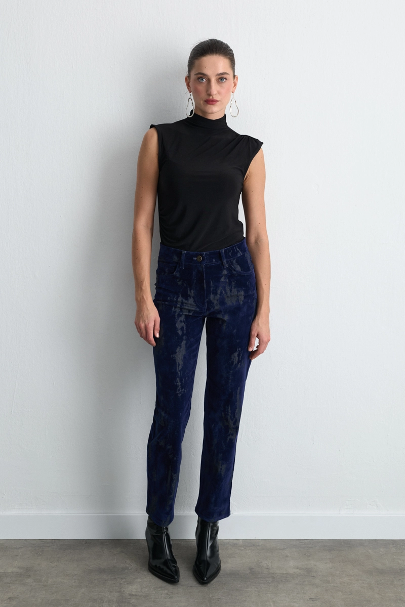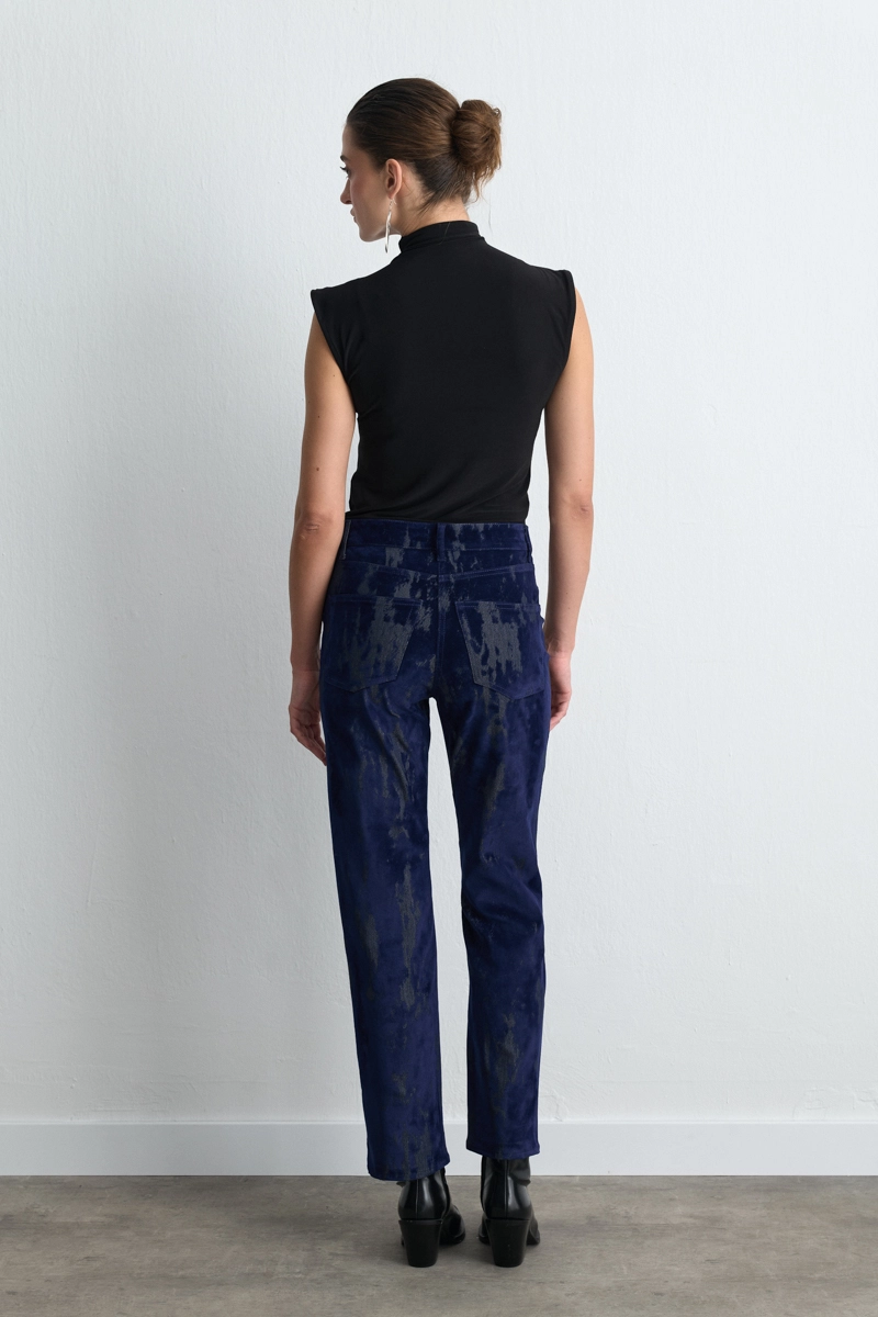 The velvet texture provides luxurious shine and refined elegance. The navy tone adds noble sophistication. The straight-leg cut creates a balanced silhouette. Flocked pattern details add a sophisticated touch. It is perfect for a stylish look at any time of day.
