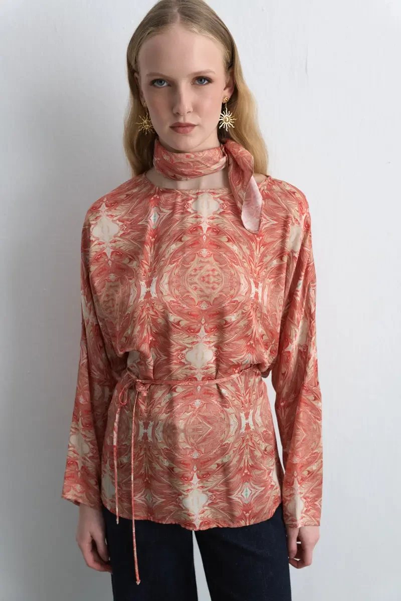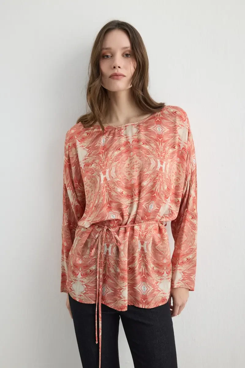 Romantik pembesi ve ip kemer detayıyla öne çıkan bu bluz, feminen ve zarif bir görünüm sunar. Rahat kesimiyle gün boyu konforlu kullanım sağlarken, kemer detayı bel hattını vurgular. Hem etek hem de pantolonlarla şık bir şekilde kombinlenebilir.