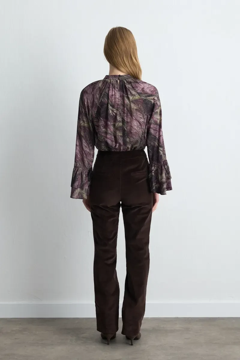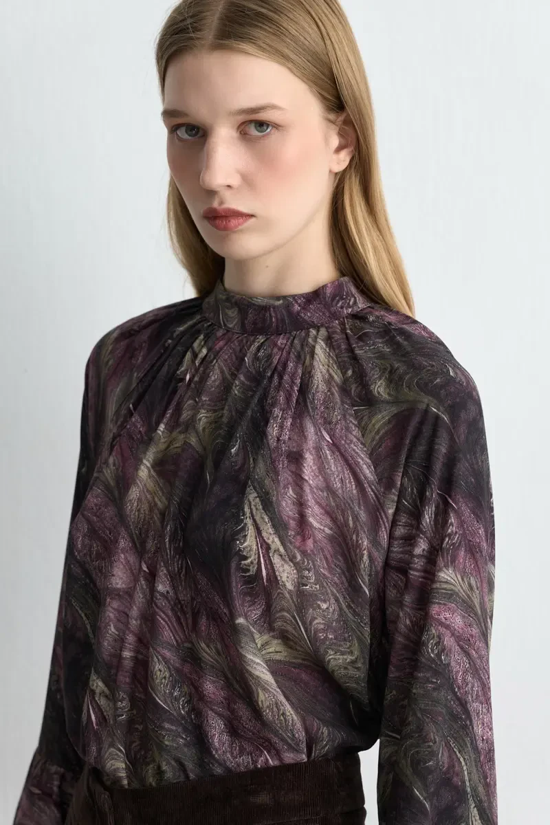 Mürdüm tonu sofistike ve zarif bir görünüm kazandırır. Volanlı kolları feminen bir hareket kazandırır. Dik yakası modern bir şıklık sunar. Viskon dokusu hafif ve konforlu bir kullanım sağlar. Günlük veya özel davet kombinlerinde öne çıkan bir parçadır.