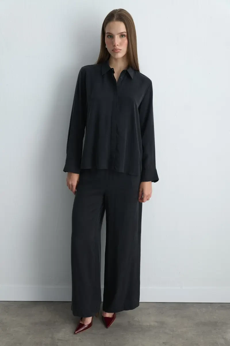 Doğal dokusu ve hafif yapısıyla şıklığı konforla buluşturur. Siyah tonu her stile uyum sağlayan zamansız bir alternatiftir. Modern kesimiyle iş hayatında veya günlük hayatta rahatlıkla tercih edilebilir. Takılarla desteklendiğinde elegan bir hava kazanır.