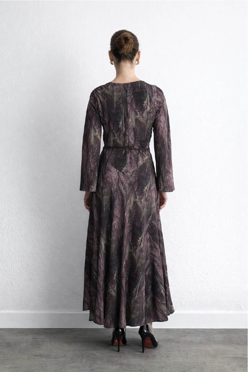 Mürdüm tonlarıyla göz alıcı bir duruş kazandırır. Desenli yüzeyi zarif bir hareketlilik oluşturur. V yaka kesimi feminen bir zarafet sunarken, uzun formu zarif bir siluet yaratır. Akıcı kumaşı gün boyu konfor sağlar. Günlük kullanımda veya özel davetlerde şıklığı ön plana çıkarır.