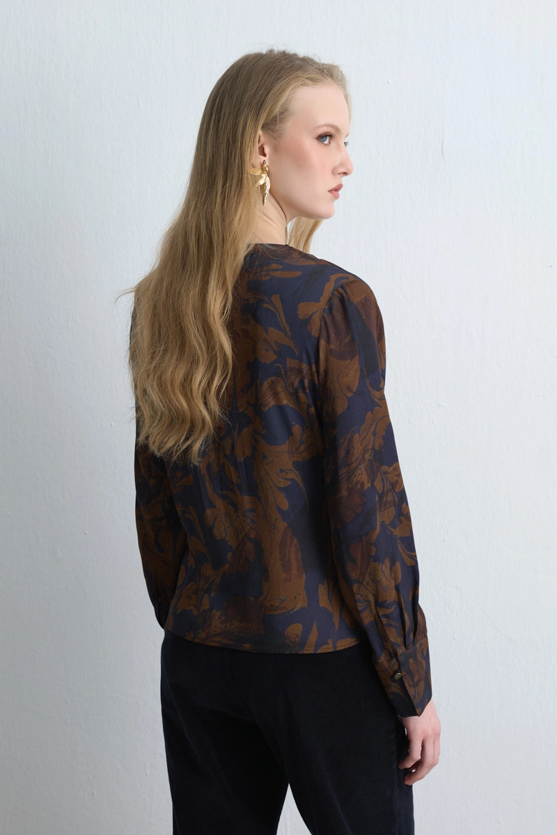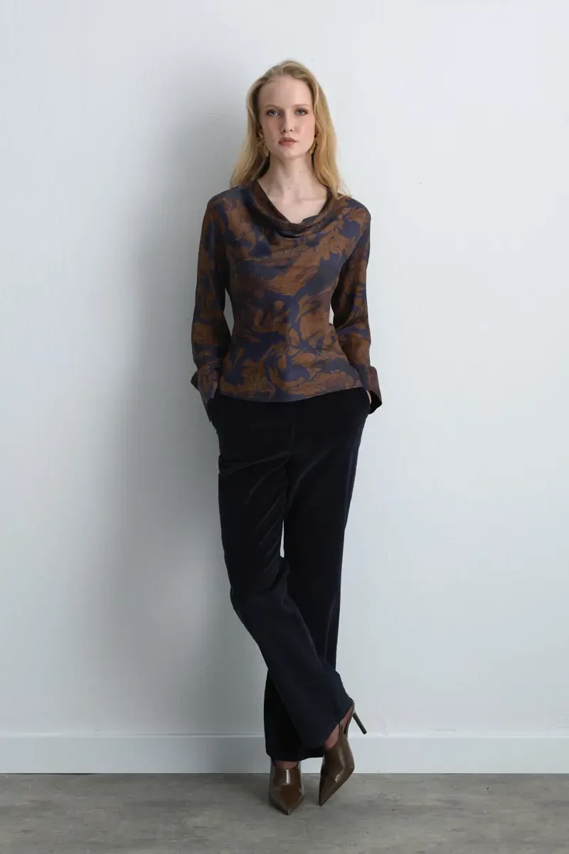 Parlak saten dokusuyla zarif bir şıklık sunan bu bluz, degaje yaka detayı sayesinde feminen bir hava katar. Kahverengi tonu, hem günlük hem de özel davet kombinlerine sofistike bir dokunuş yapar. Viskon kumaşıyla hafif ve rahat bir kullanım imkânı sağlar. Şıklığı ön planda tutan modern ve kullanışlı bir parça olarak gardıroba değer katar.