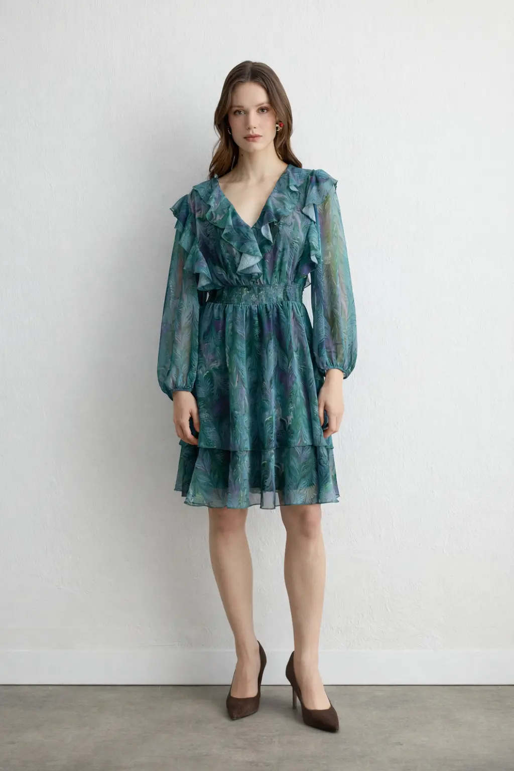 Volanlı kesim zarif bir hareket ve feminen bir hava katıyor. Yeşil tonları canlı ve taze bir görünüm sağlıyor. Şifon dokusu hafif ve akıcı bir siluet oluşturuyor. Özel davet ve akşam kombinleri için ideal. Belden oturan yapısı silueti ön plana çıkarıyor. Renk ve dokunun uyumu stilin enerjisini yükseltiyor.