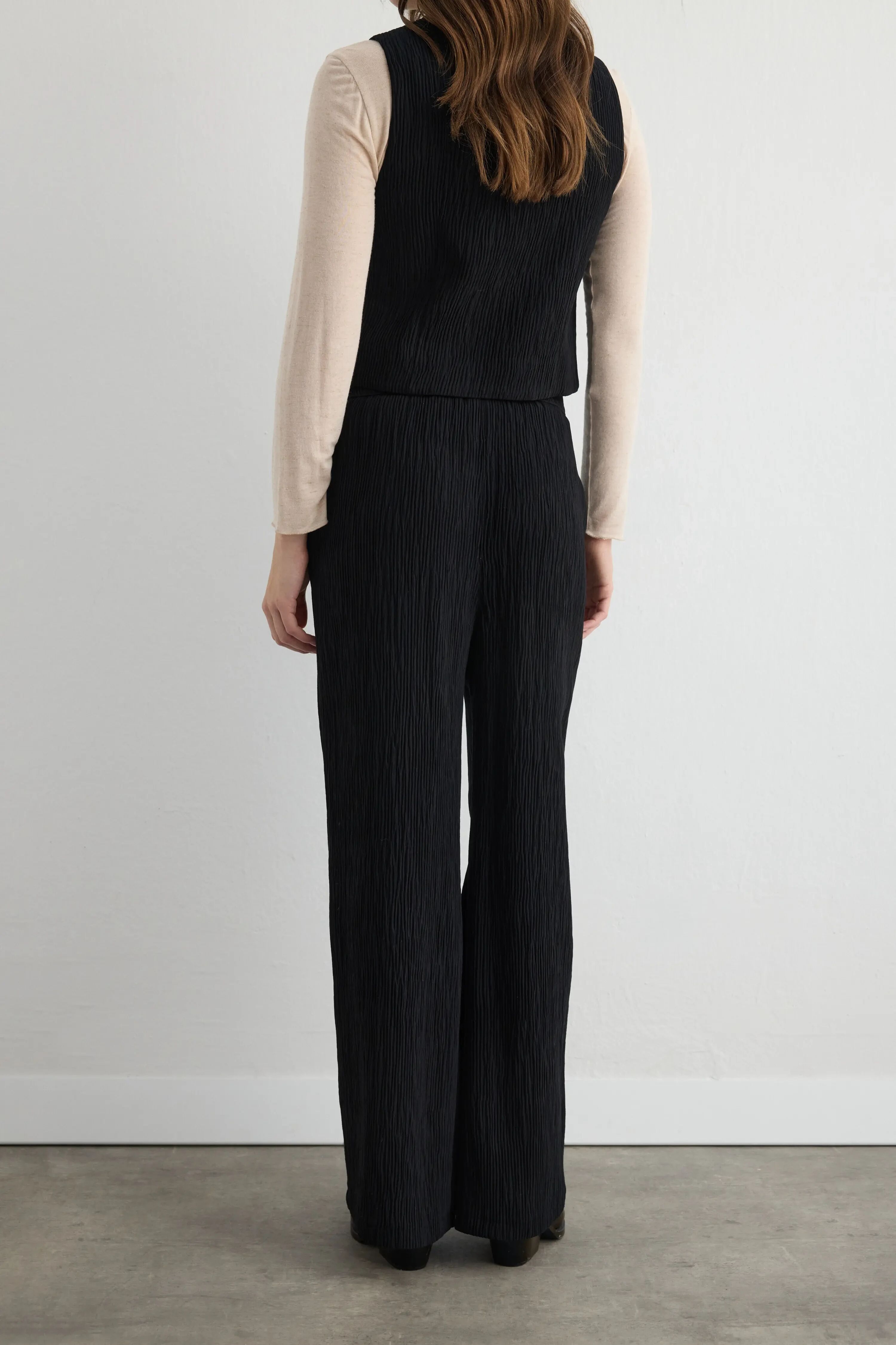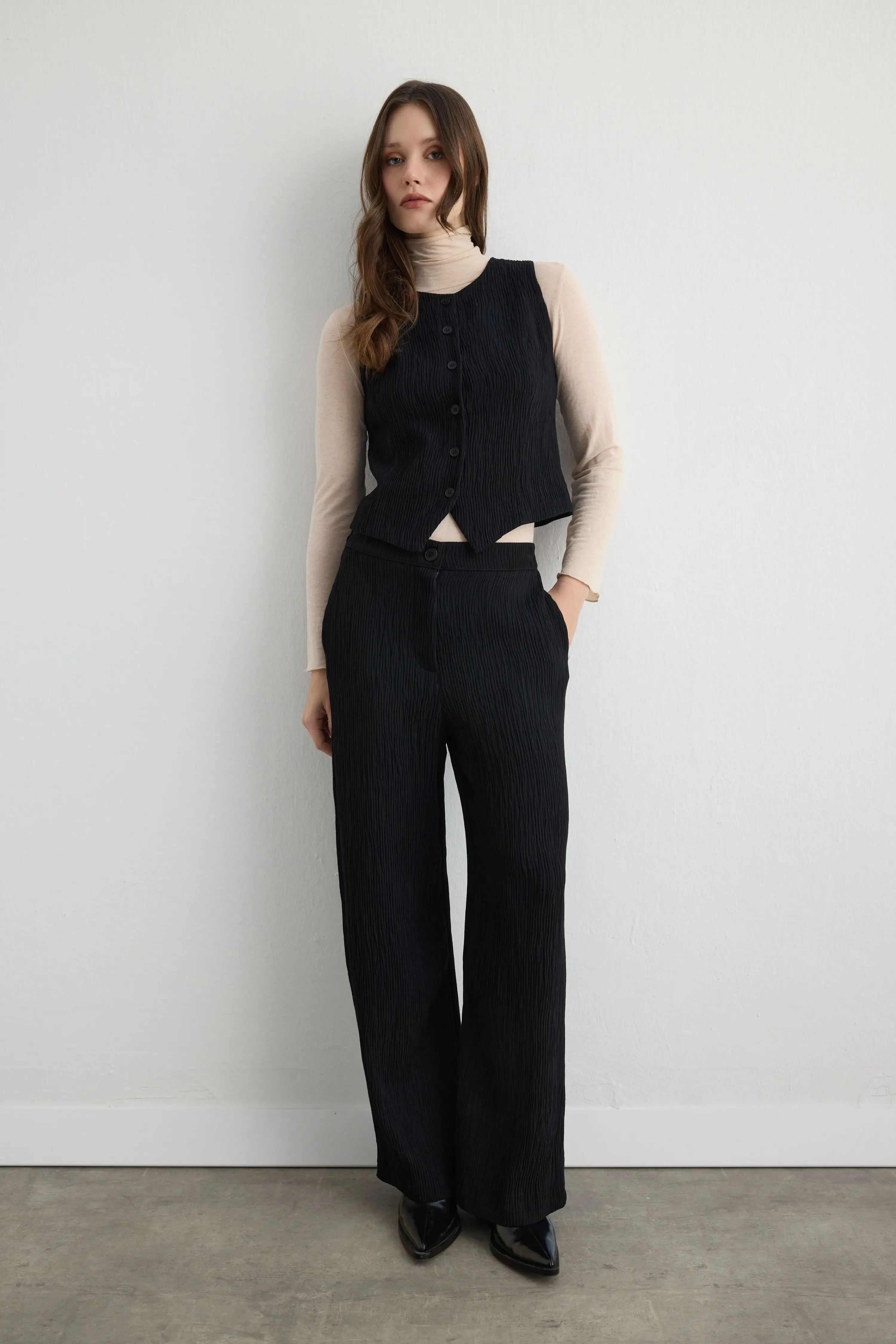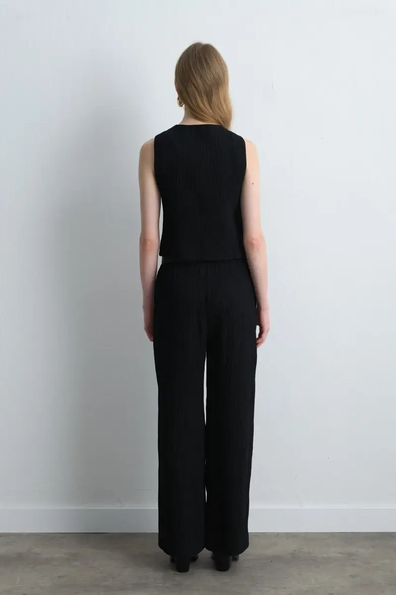 Anka Koleksiyonu Yuvarlak Yakalı Krinkıl Yelek & Pantolon - Siyah Takım