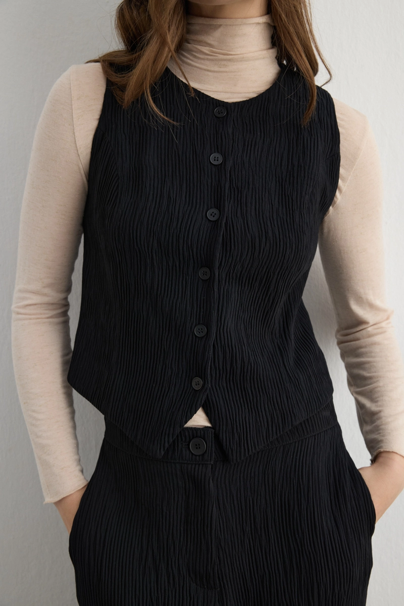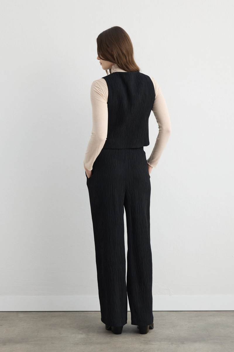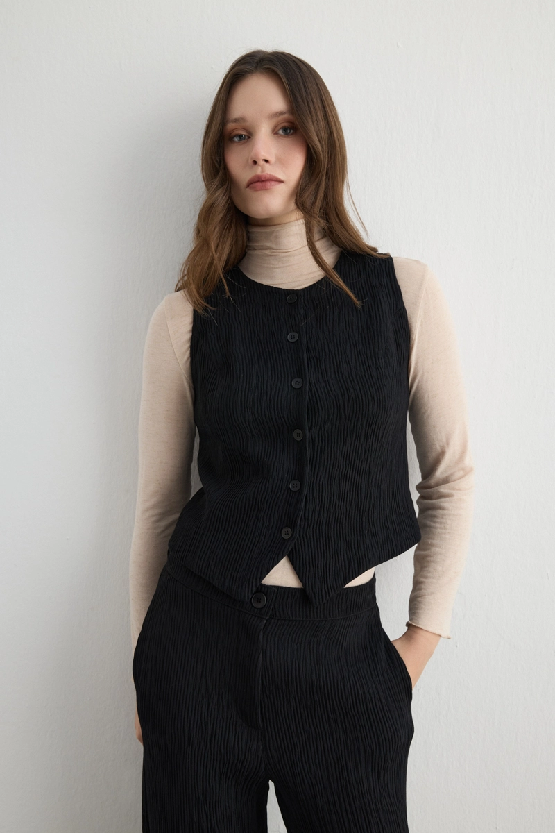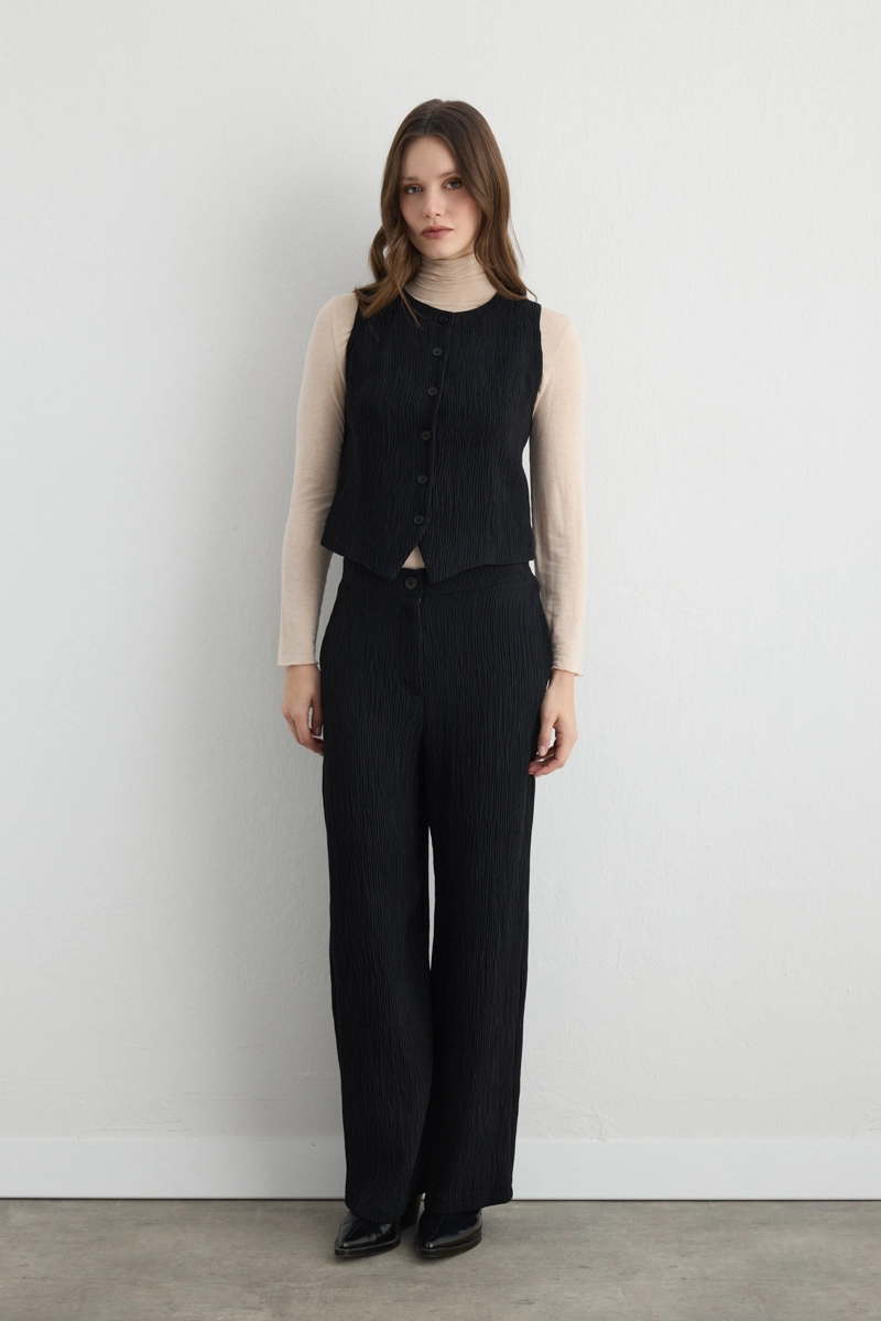 A round-neck crinkle vest, designed exclusively for the Anka Collection, offers timeless elegance in black. Its lightweight and flowing structure ensures comfort all day, making it a stylish addition to both daily outfits and special occasions. Modern lines and unique design make it one of the collection’s standout pieces.