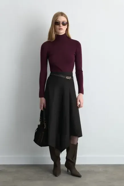 Anvelop kesimi sayesinde modern ve akıcı bir siluet oluşturuyor. Asimetrik etek ucu hareketli bir görünüm kazandırırken, yünlü kaşe dokusu sıcaklık ve konfor sunuyor. Tek renk tasarımı hem klasik hem şehirli kombinlerde güçlü bir tamamlayıcı olarak öne çıkıyor.