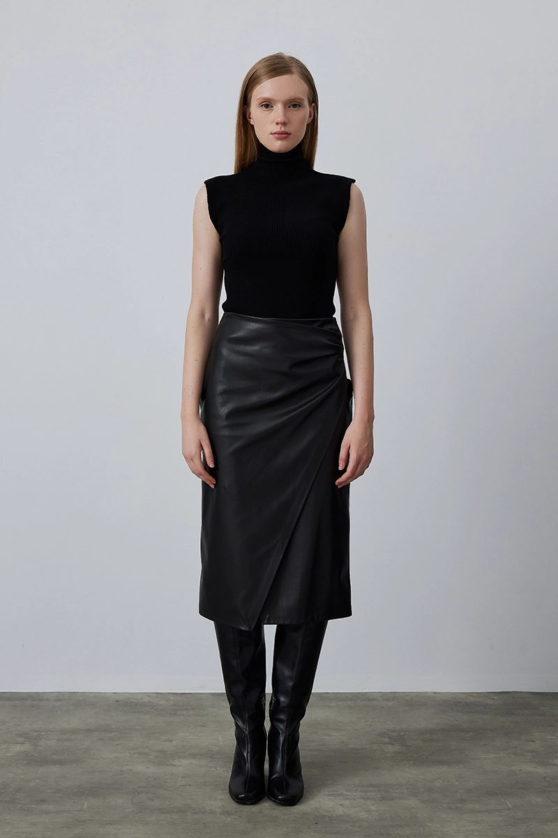 Anvelop detayı modern ve zarif bir siluet oluşturur. Deri dokusu iddialı bir şıklık kazandırır. Siyah tonu farklı stillerle kolayca uyum sağlar. Özel günlerden günlük şıklığa kadar kullanılabilir.