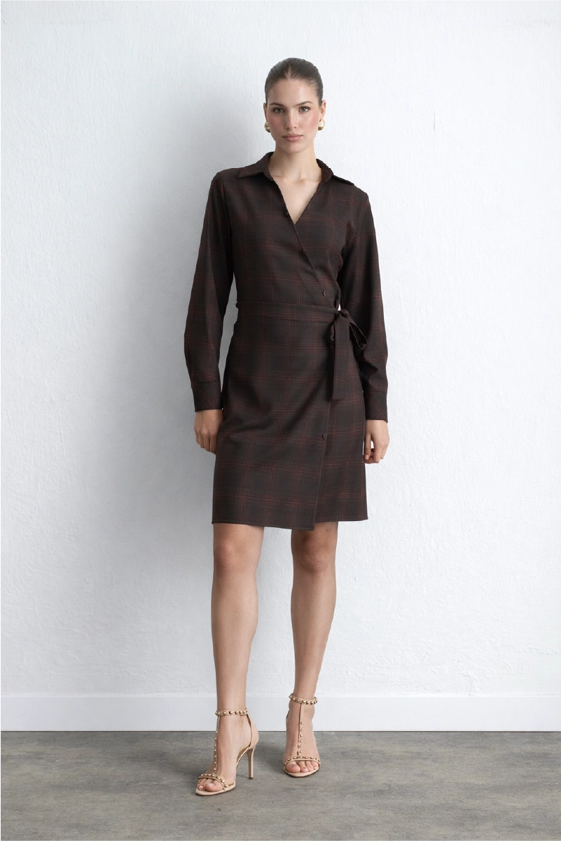 Klasik ekose deseniyle nostaljik bir hava yaratır. Anvelop kesim, feminen bir duruş kazandırırken rahatlığı da ön planda tutar. Kahverengi tonları sonbahar ve kış kombinlerine doğal bir uyum sağlar. Çizme ve kemerlerle tamamlandığında şıklık pekişir.