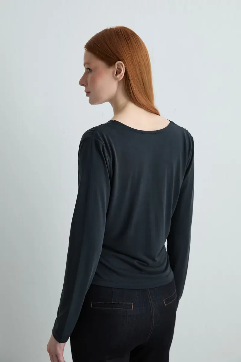 Zarif anvelop kesimiyle feminen bir duruş sunan siyah modal örme bluz, vücut hatlarını zarifçe vurgular. Yumuşak dokulu kumaşı gün boyu rahatlık sağlarken, sade tasarımıyla hem ofis hem davet kombinlerinde yer alabilir.