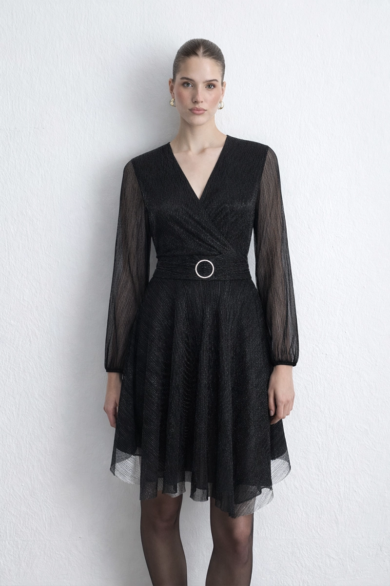 The wrap cut offers a feminine and elegant silhouette. Its shimmering surface draws attention at special events. The black tone provides a classic and sophisticated look. Its flowing structure highlights elegance. It is an ideal choice for special evenings. Elegant details enhance the power of the style.