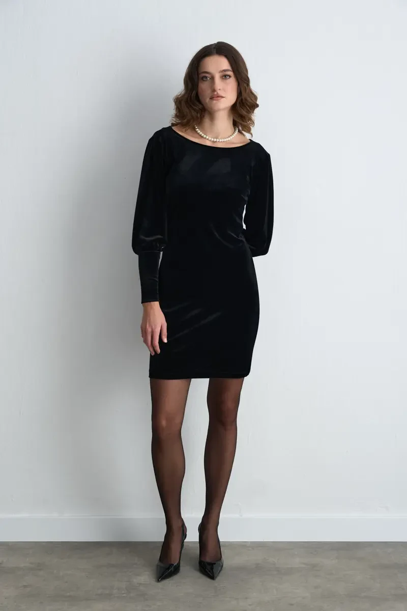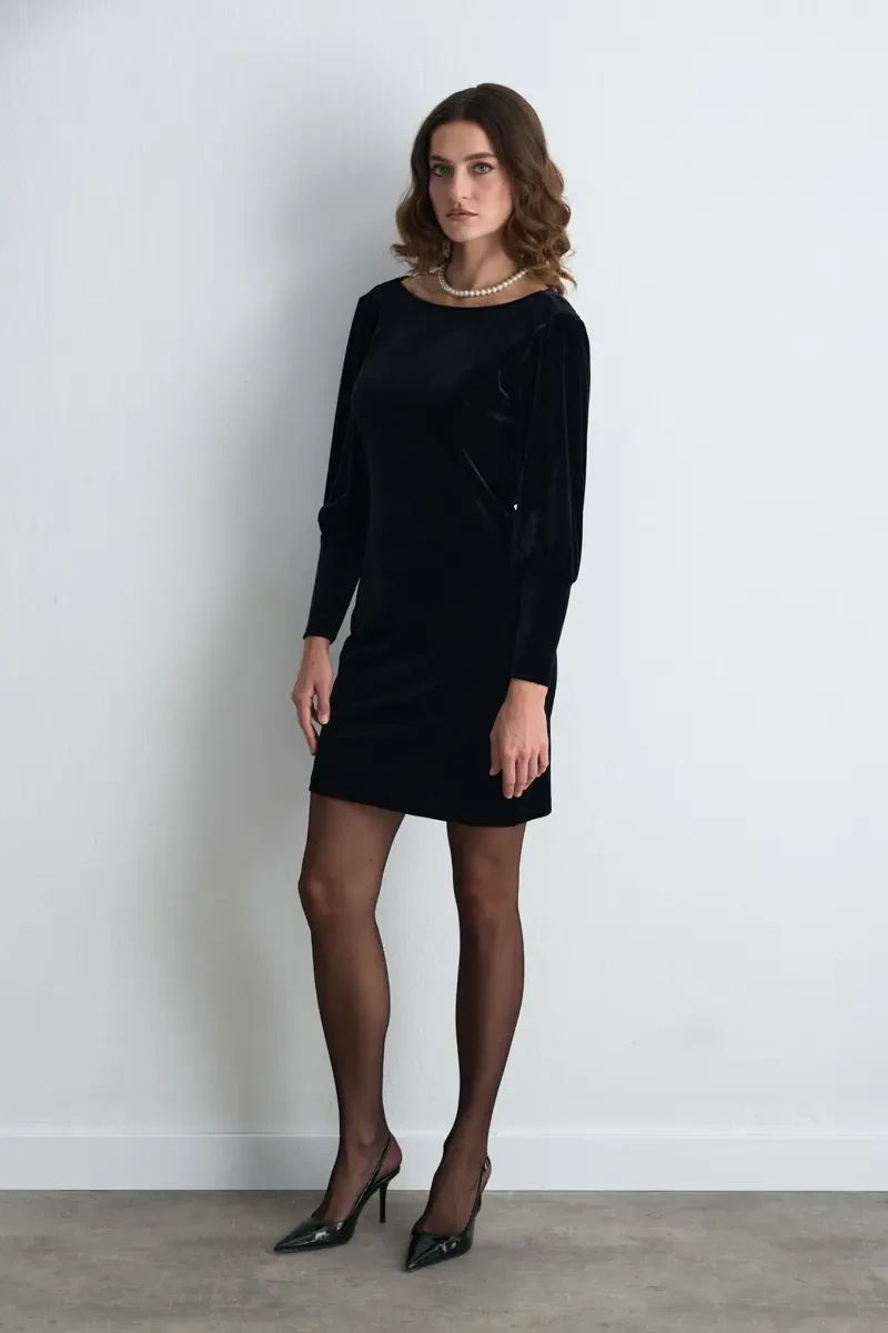 Its black color provides a classic and attractive look. The back cut-out detail adds a delicate shimmer and feminine touch. The velvet texture offers softness and shine for a luxurious feel. The mini cut creates a modern style. It delivers simple yet impressive elegance for special occasions.