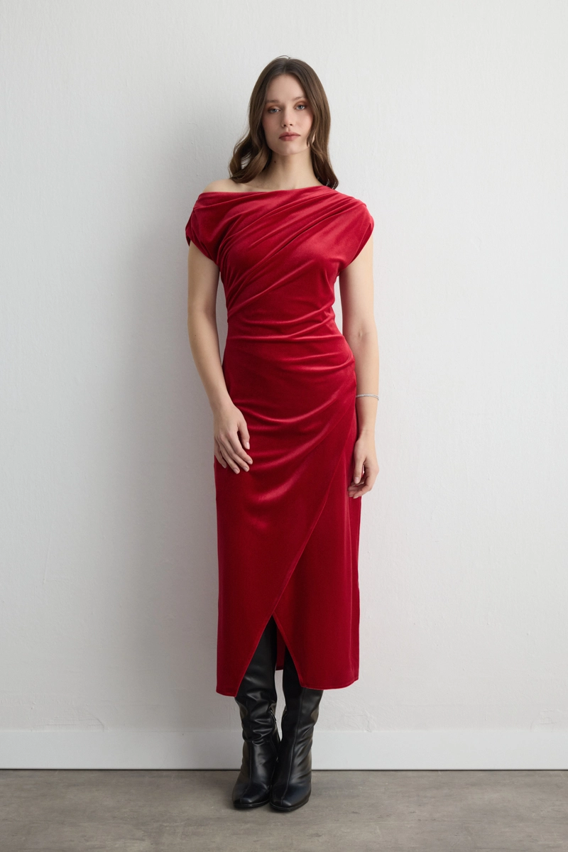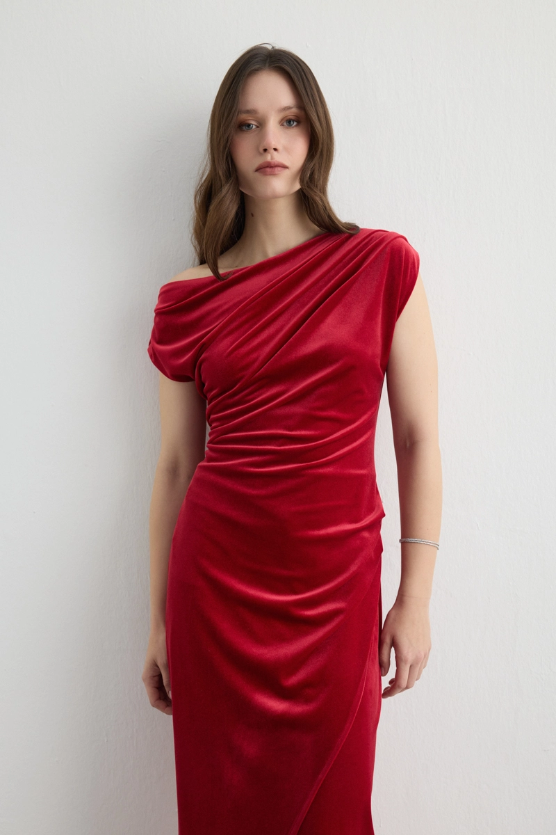 Asimetrik omuz kesimi dikkat çekici ve iddialı bir stil oluşturuyor. Kadife dokusu lüks ve zarif bir görünüm sunuyor. Canlı kırmızı ton enerjik ve sofistike bir etki yaratıyor. Uzun kesim feminen silueti öne çıkarıyor. Özel davet ve akşam kombinleri için ideal. Parlak ve dokulu yüzey stilin karakterini güçlendiriyor.