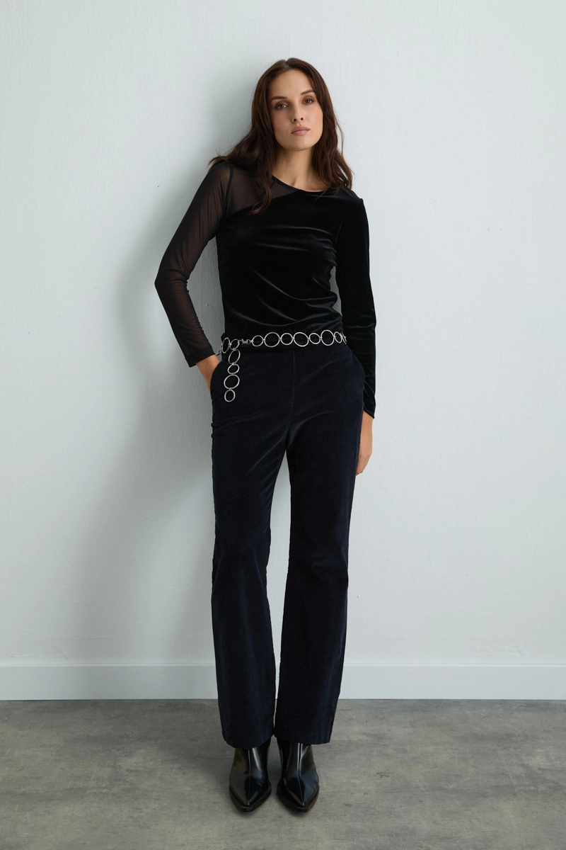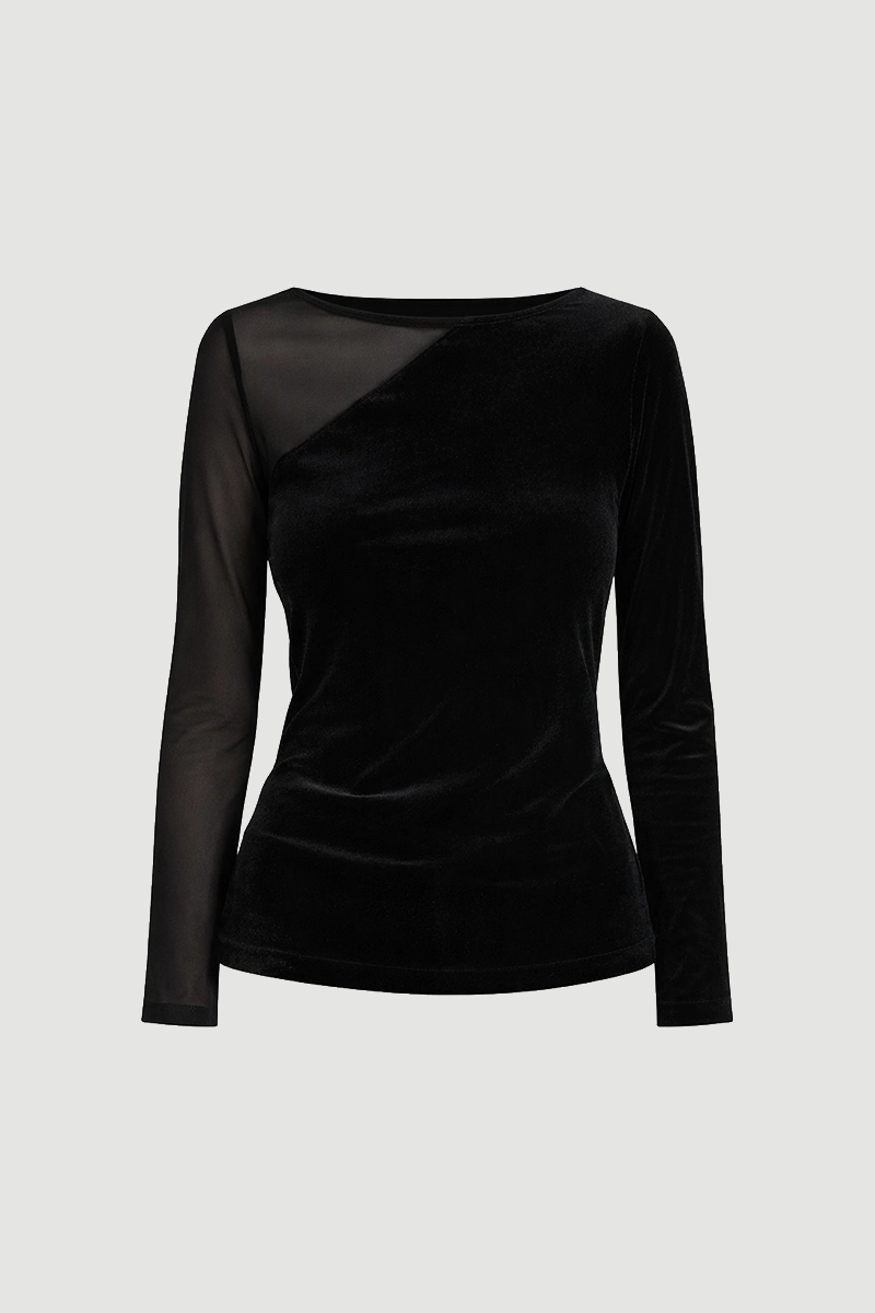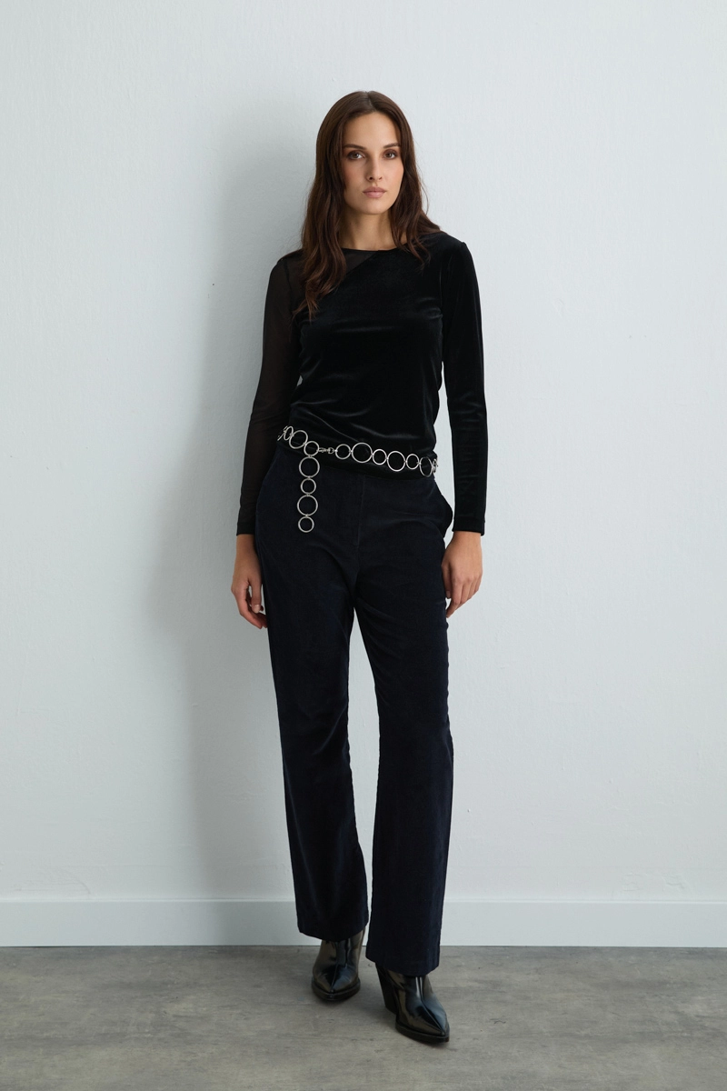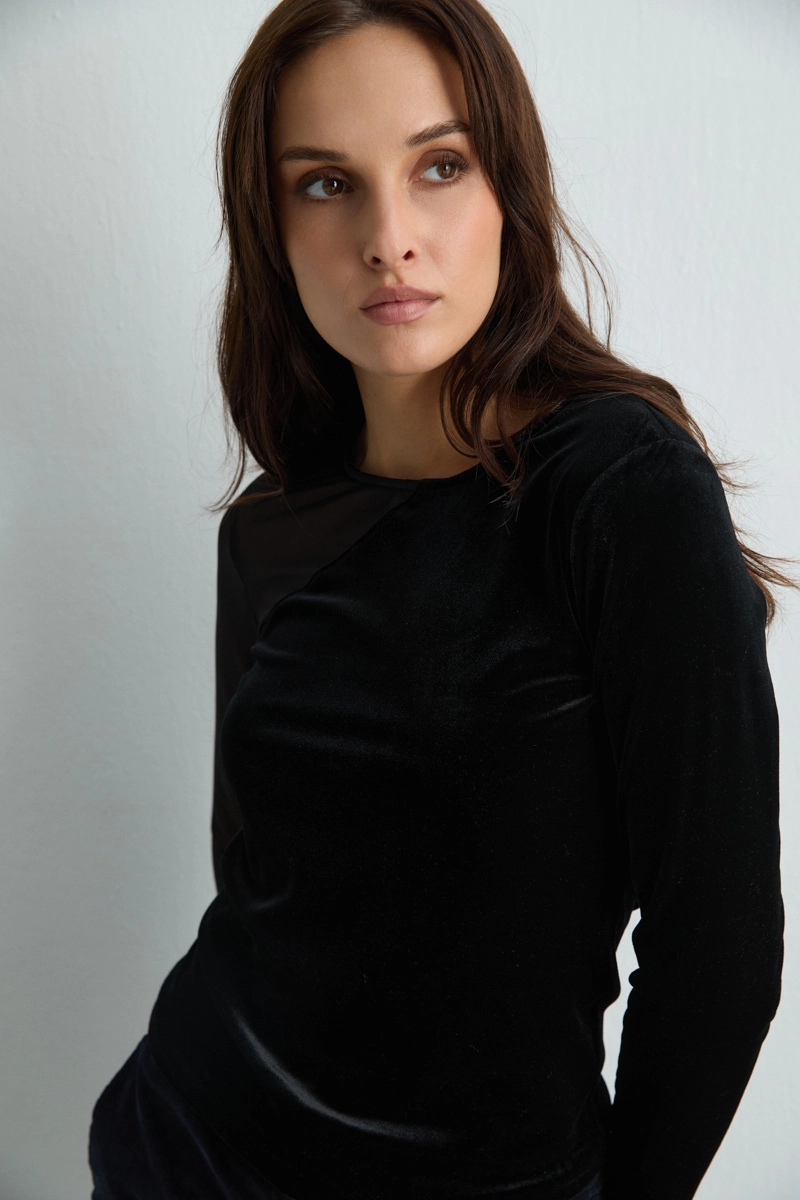 Kadife kumaşın zarafetini tül yaka detayıyla birleştiren bu siyah bluz, özel günlerde göz alıcı bir görünüm sunar. Asimetrik kesimi modern bir dokunuş kazandırırken, kadifenin yumuşak dokusu lüks bir his yaratır.