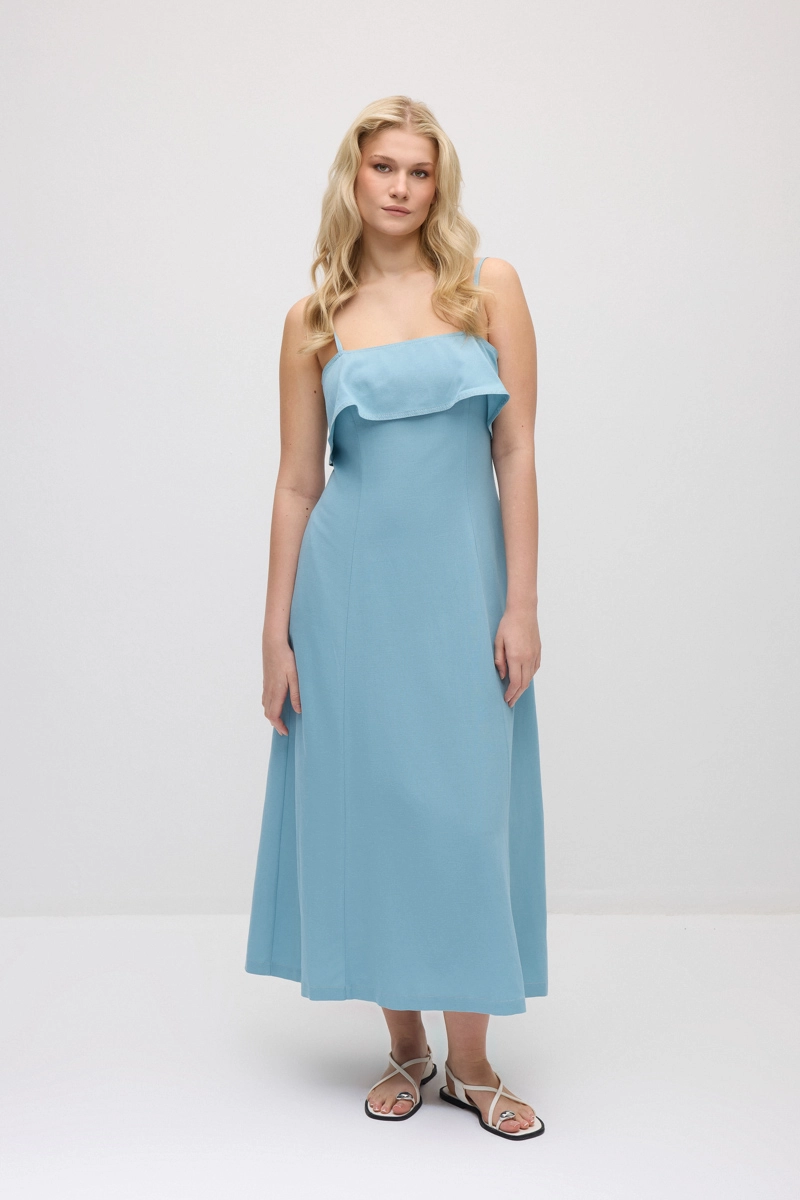 Pamuk keten karışımı kumaşıyla hafif ve nefes alabilen bir yapı sunar. Askılı tasarımı yaz stiline ferah bir dokunuş katar. Ön kısımdaki volan detayları hareketli bir görünüm oluşturur. Günlük yaz kombinleri için ideal bir seçimdir.