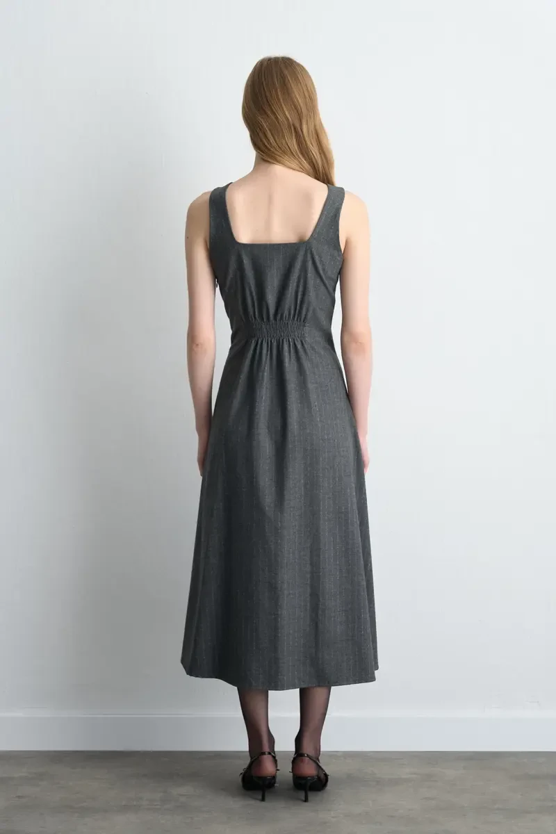 Gri tonu sade ve modern bir görünüm kazandırır. Askılı formu zarif bir duruş oluşturur. Akıcı kumaşı konforlu bir kullanım sağlar. Uzun boyu feminen bir siluet sunar. Günlük veya katmanlı kombinlerde şık bir alternatif oluşturur.