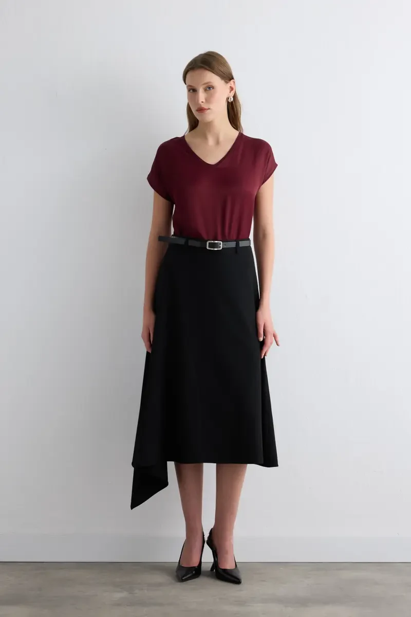 This modern-cut piece stands out with its asymmetric form and elegant belt detail, offering a unique style. Thanks to the refined appeal of black, it can be easily preferred for both office looks and special events. An ideal choice for those who want to reflect both elegance and dynamism.
