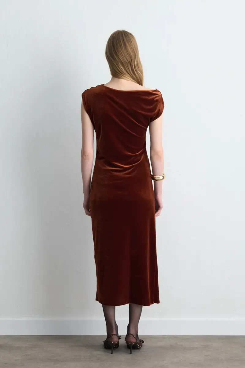The terracotta tone gives a warm and sophisticated feel. The velvet fabric provides luxurious shine and softness. The asymmetric shoulder cut creates a modern appearance. The long form offers a graceful silhouette. A bold and elegant choice for special occasions.