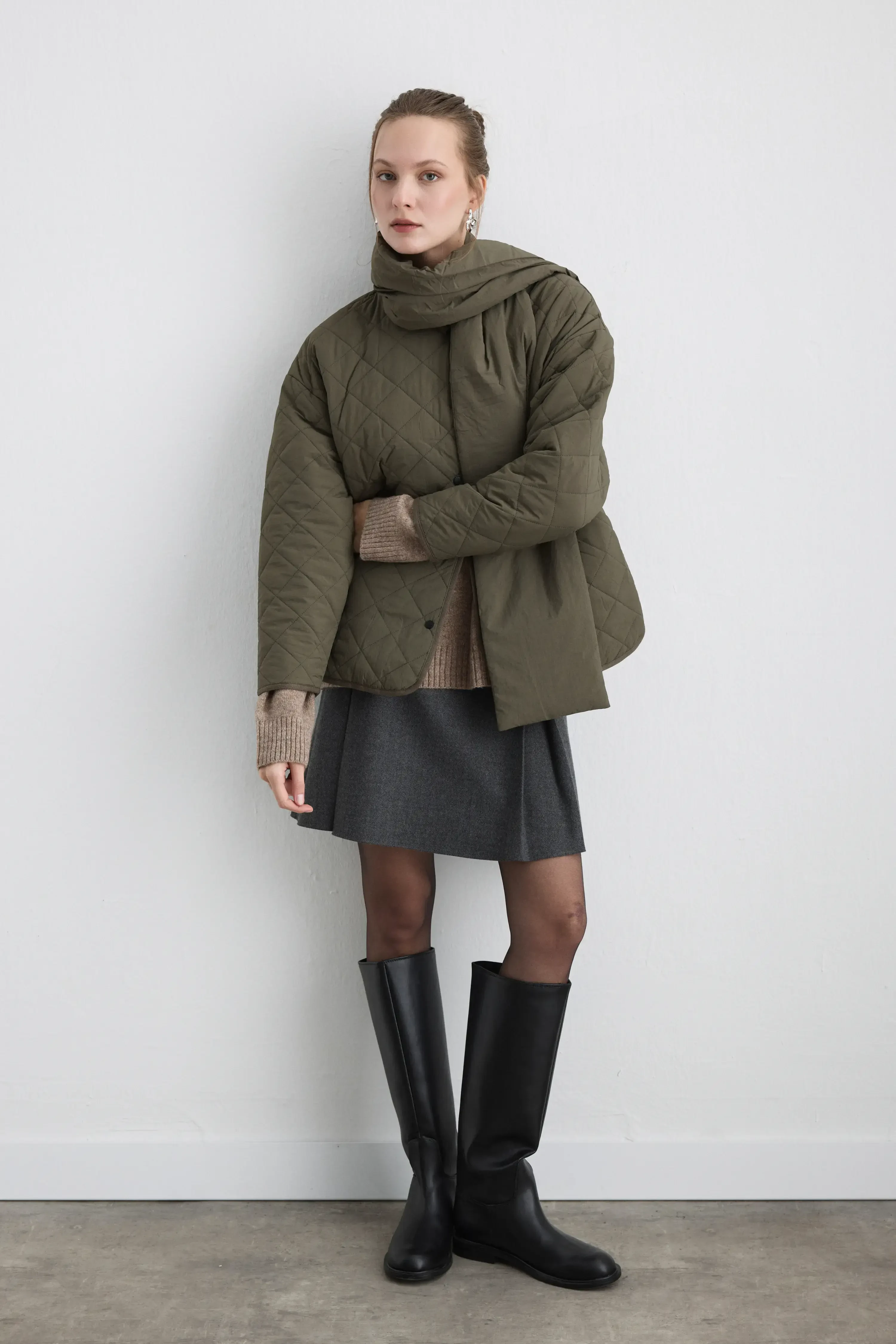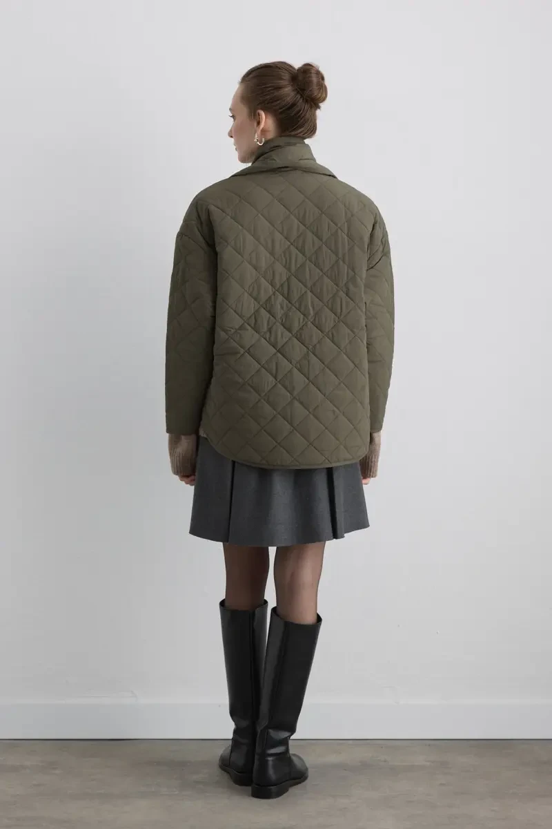 Kapitone dokusu ve beraberindeki atkı detayıyla zarif bir uyum yakalıyor. Haki rengi doğadan ilham alan bir zarafet sunarken, dolgulu yapısı sıcak tutuyor. Hem işlevsel hem stil sahibi bir dış giyim seçeneği.