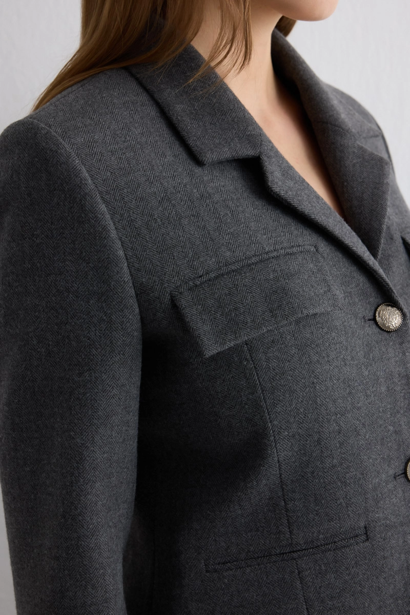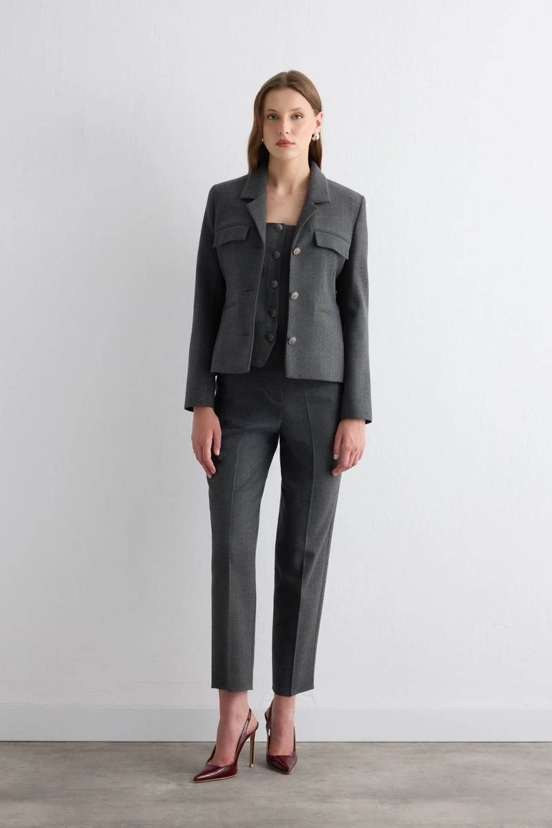 Desenli dokusu klasik bir görünüm sunar. Gri tonu zamansız kombinlere uyum sağlar. Rahat kalıbı hareket kolaylığı verir. Ofis şıklığının vazgeçilmez parçalarındandır. Katmanlı stilin güçlü tamamlayıcısıdır.