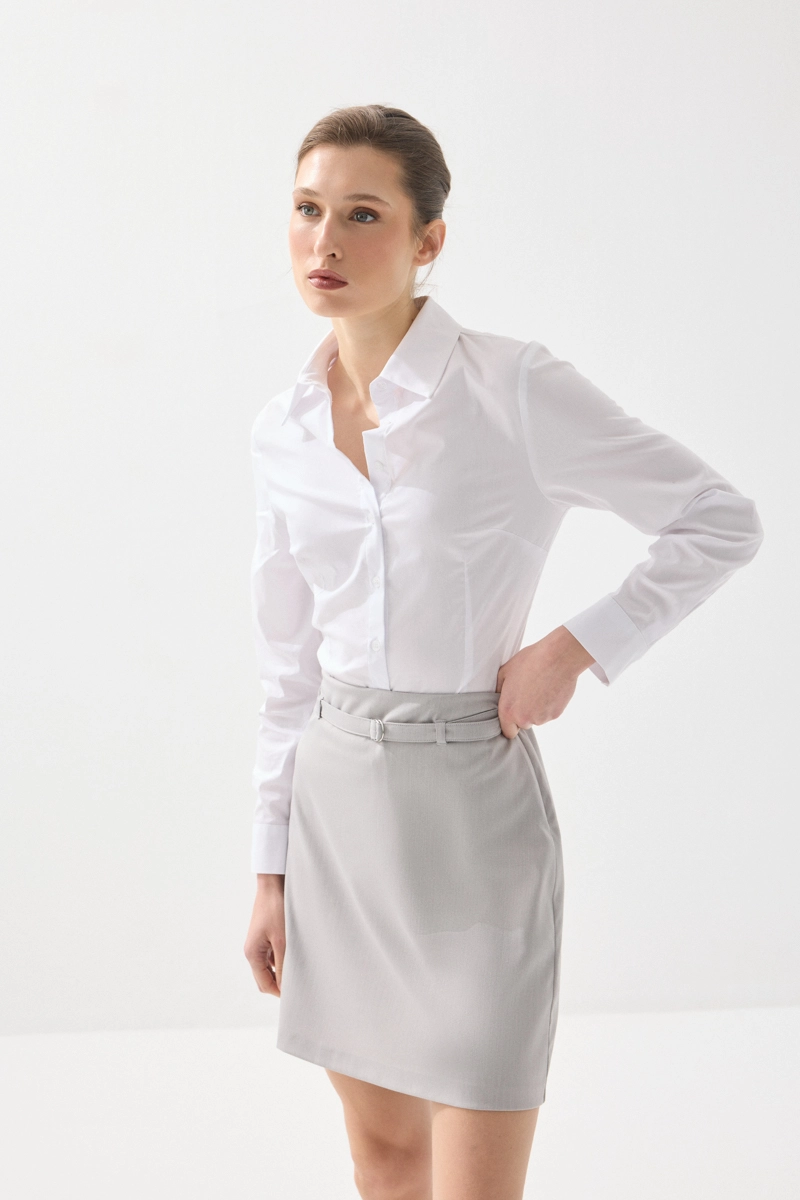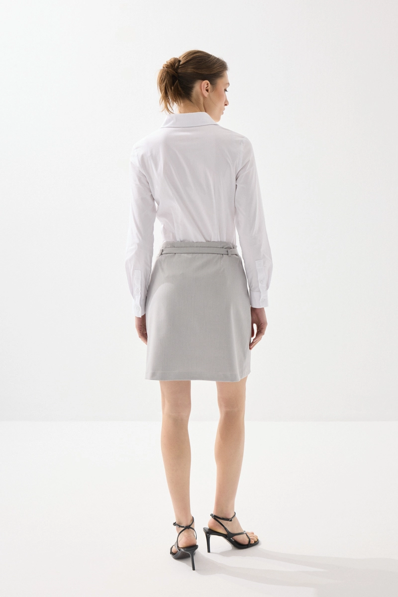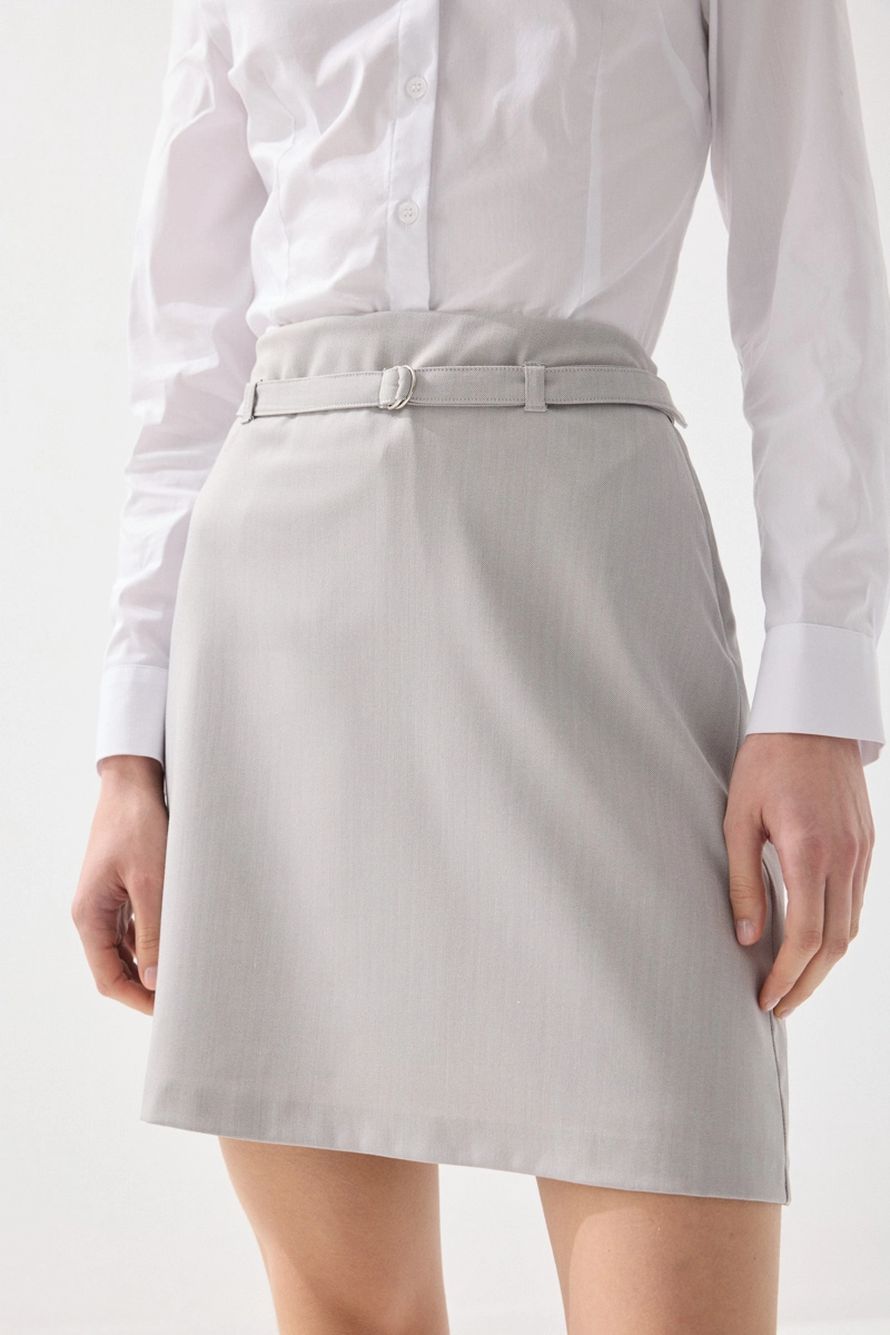 Balıksırtı dokusuyla klasik bir görünüm sunan mini etek, kemer detayıyla modern bir stil kazanır. Vücuda uyum sağlayan kesimiyle zarif bir duruş sergiler. Gri rengiyle farklı kombinlere kolayca uyum sağlar. Günlük ve ofis şıklığında tercih edilebilir. Zamansız ve şık bir parçadır.