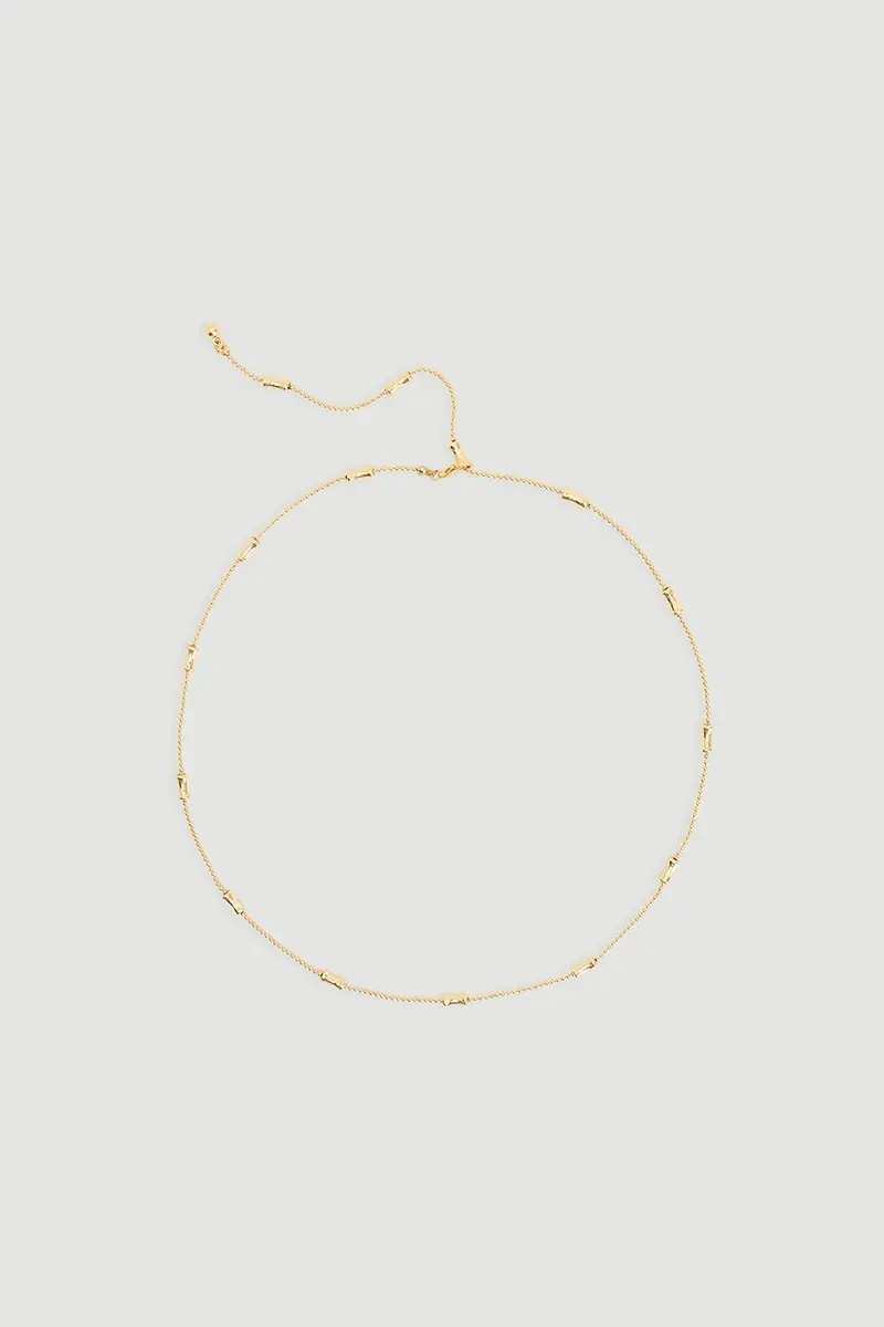 This long necklace with minimal details offers a modern look and draws attention with its top-shaped figures. The elegant shimmer of gold adds sophistication to simple outfits. Provides a delicate touch alone or creates a modern style layered with other necklaces. A chic accessory that adds uniqueness to your daily style.
