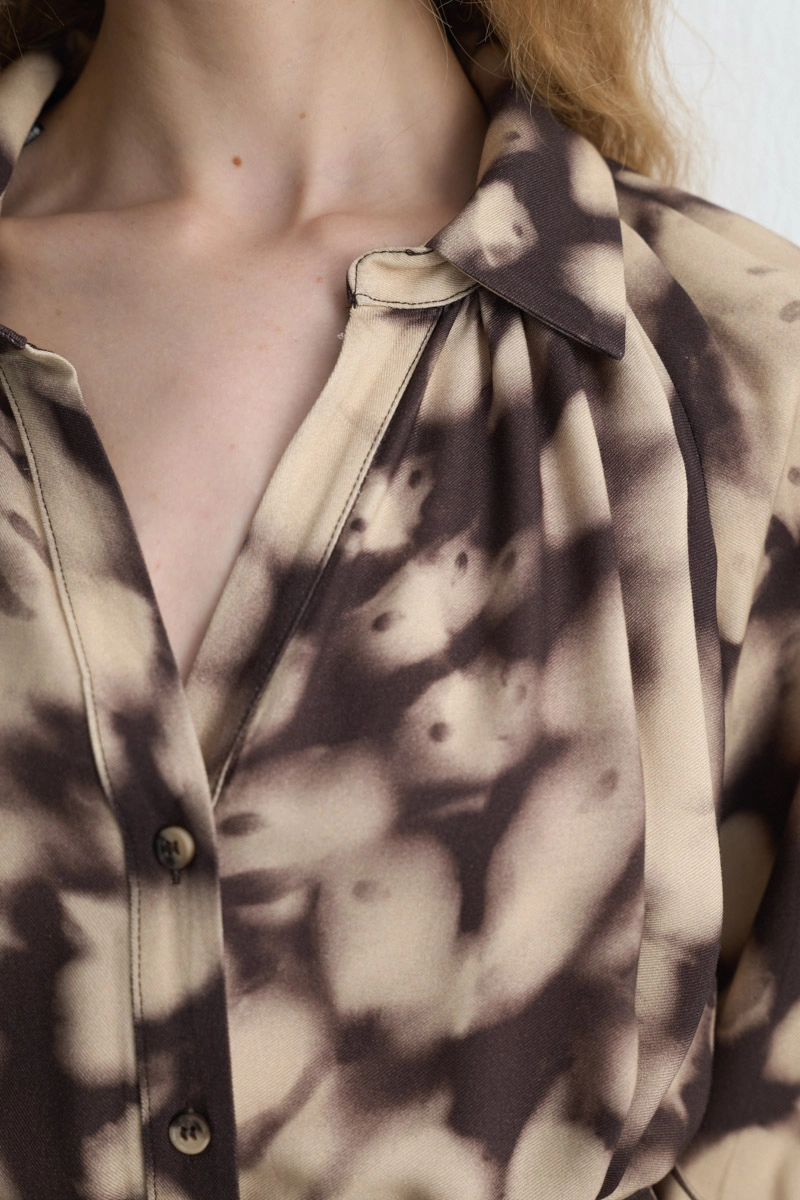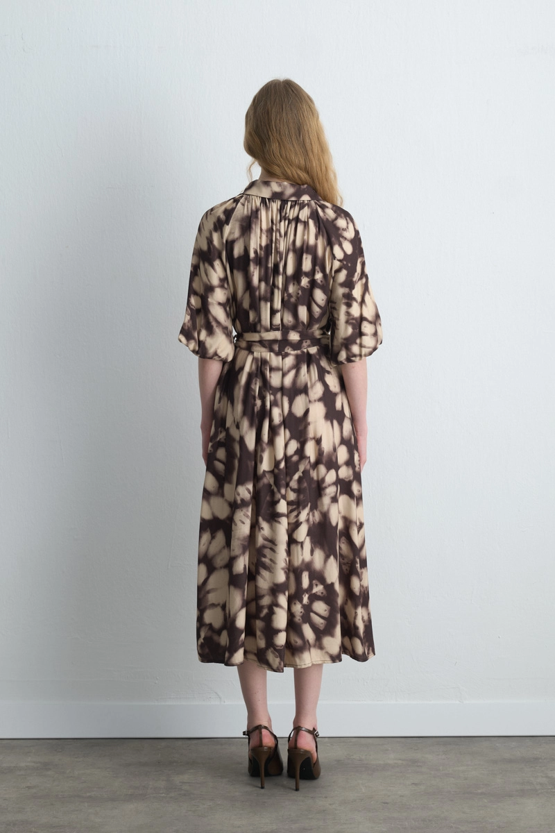 Balon kol detayı romantik bir hava katar. Viskon dokusu hafif ve konforlu bir kullanım sağlar. Kahverengi tonu doğal bir şıklık sunar. Uzun formu feminen bir duruş oluşturur.