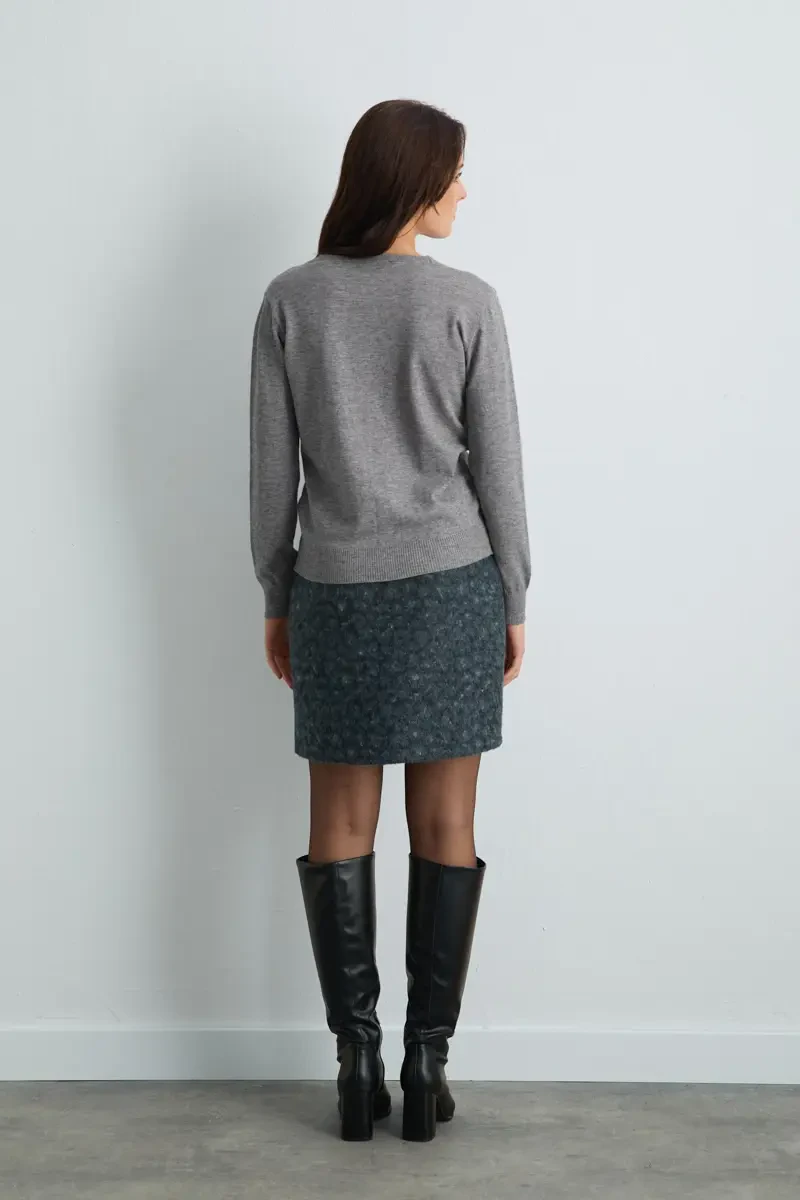 Gray basic knit cardigan, with its simple design and neutral color, pairs easily with any outfit. Soft texture and comfortable fit make it ideal for home or outdoor use. Offers minimalist elegance.