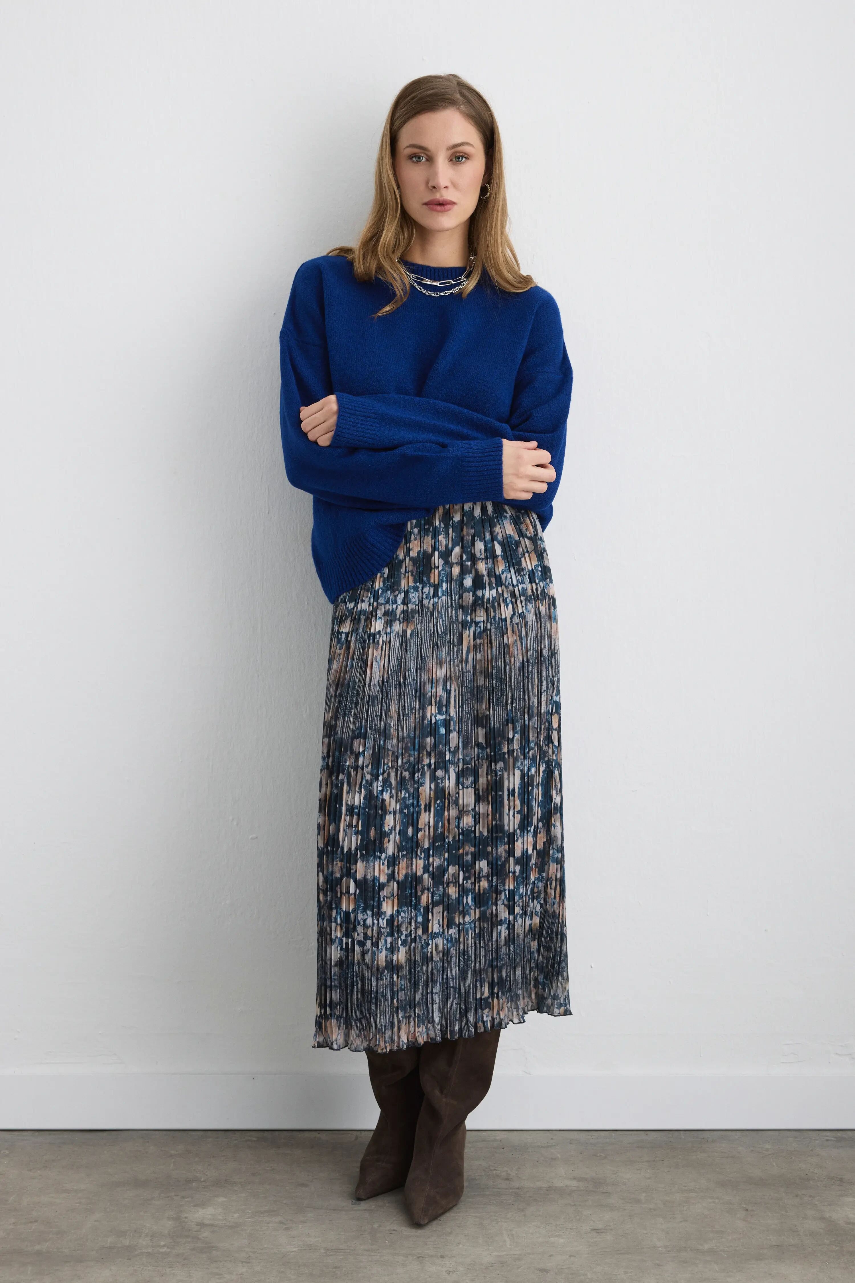 Basic Triko Kazak & Desenli Pilise Etek Kombini