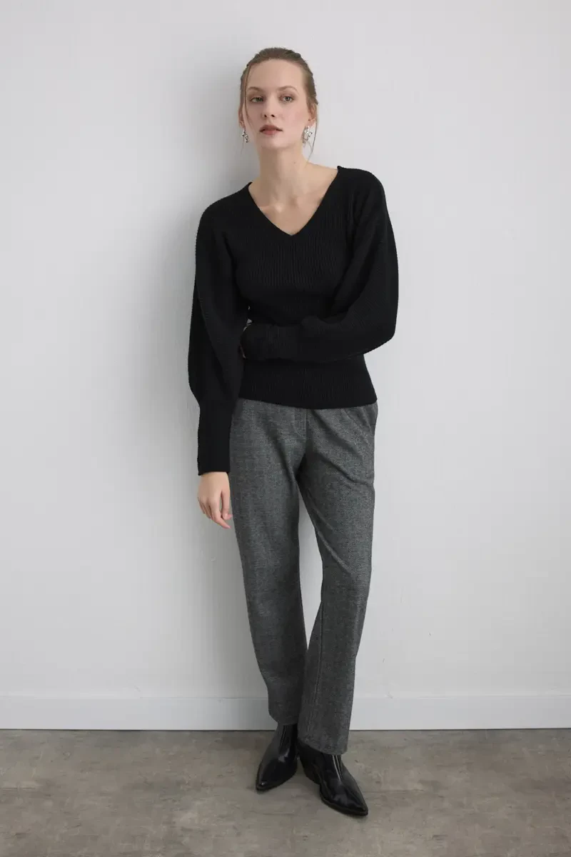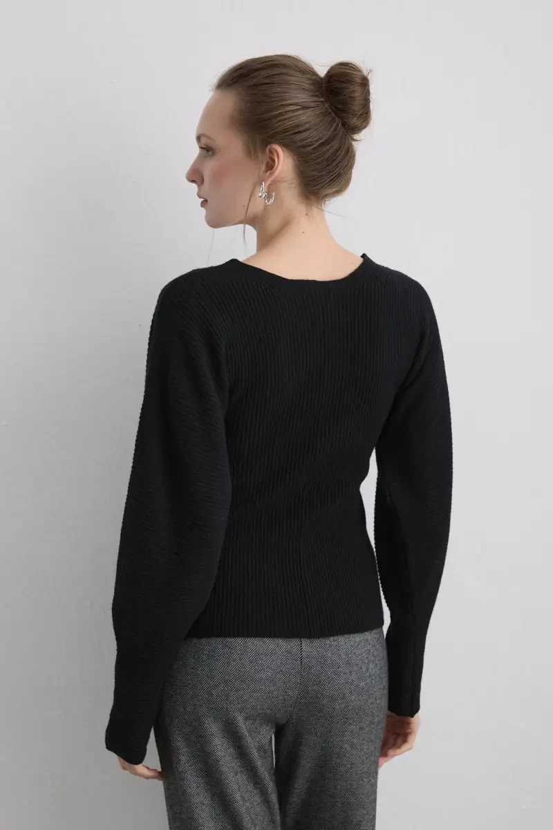 The batwing sleeve detail offers a dynamic silhouette. The woolen texture provides warmth while enhancing style. Perfect for both casual and office outfits.