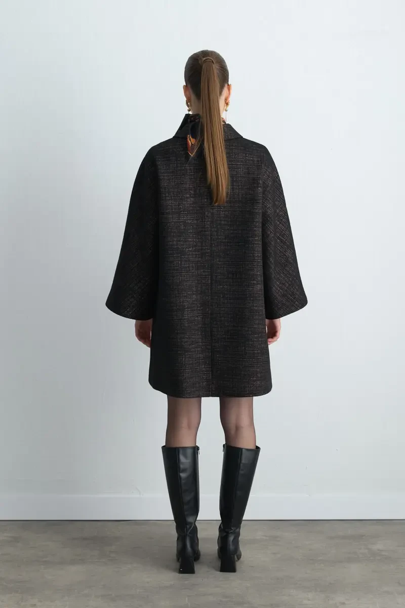Bebe yaka detayıyla zarif bir duruş sunar. Jakar dokusu klasik ve şık bir hava kazandırır. Siyah tonu çok yönlü kombin imkânı verir. Hem özel günlerde hem günlük şıklıkta tercih edilebilir.