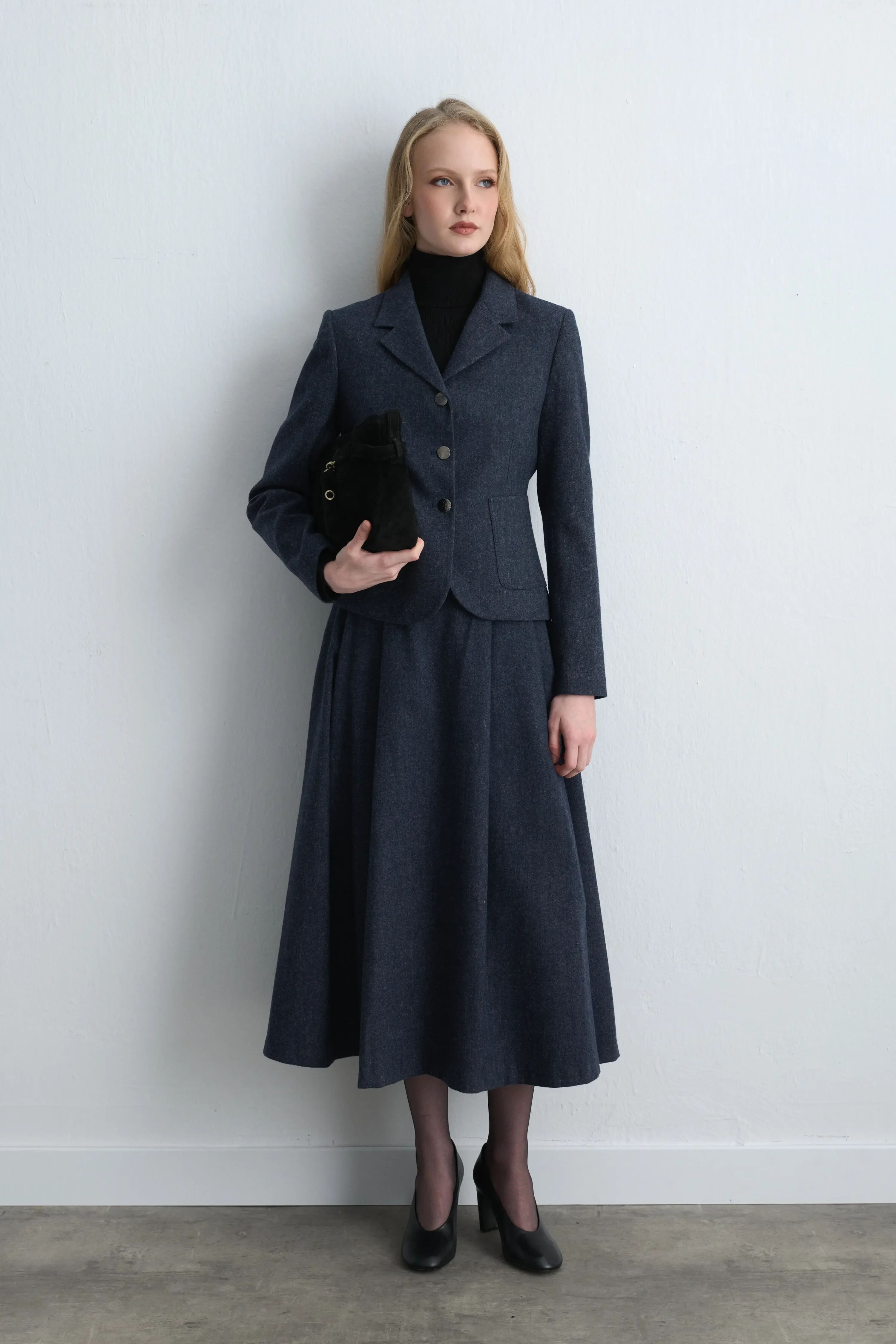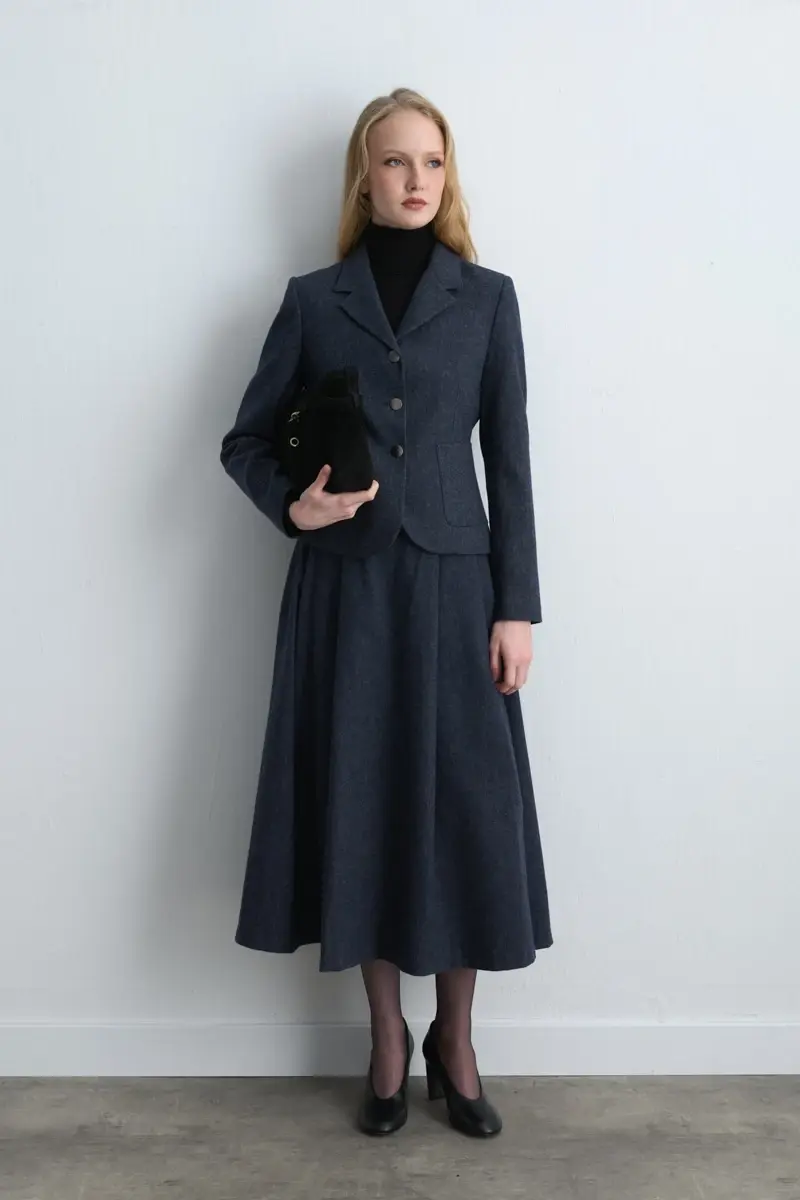 Bele Oturan Yünlü Ceket & Uzun Kloş Etek - Lacivert Takım