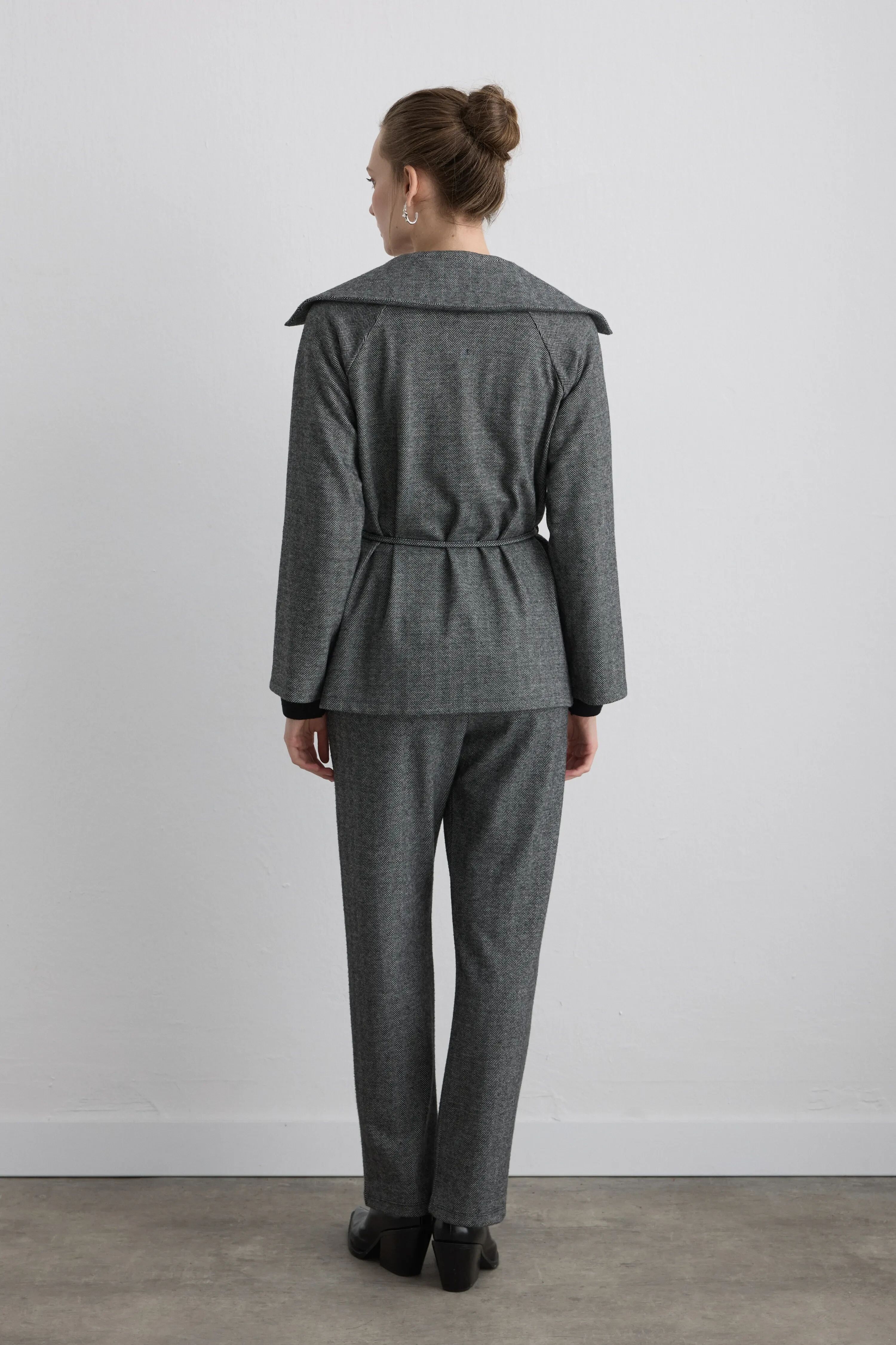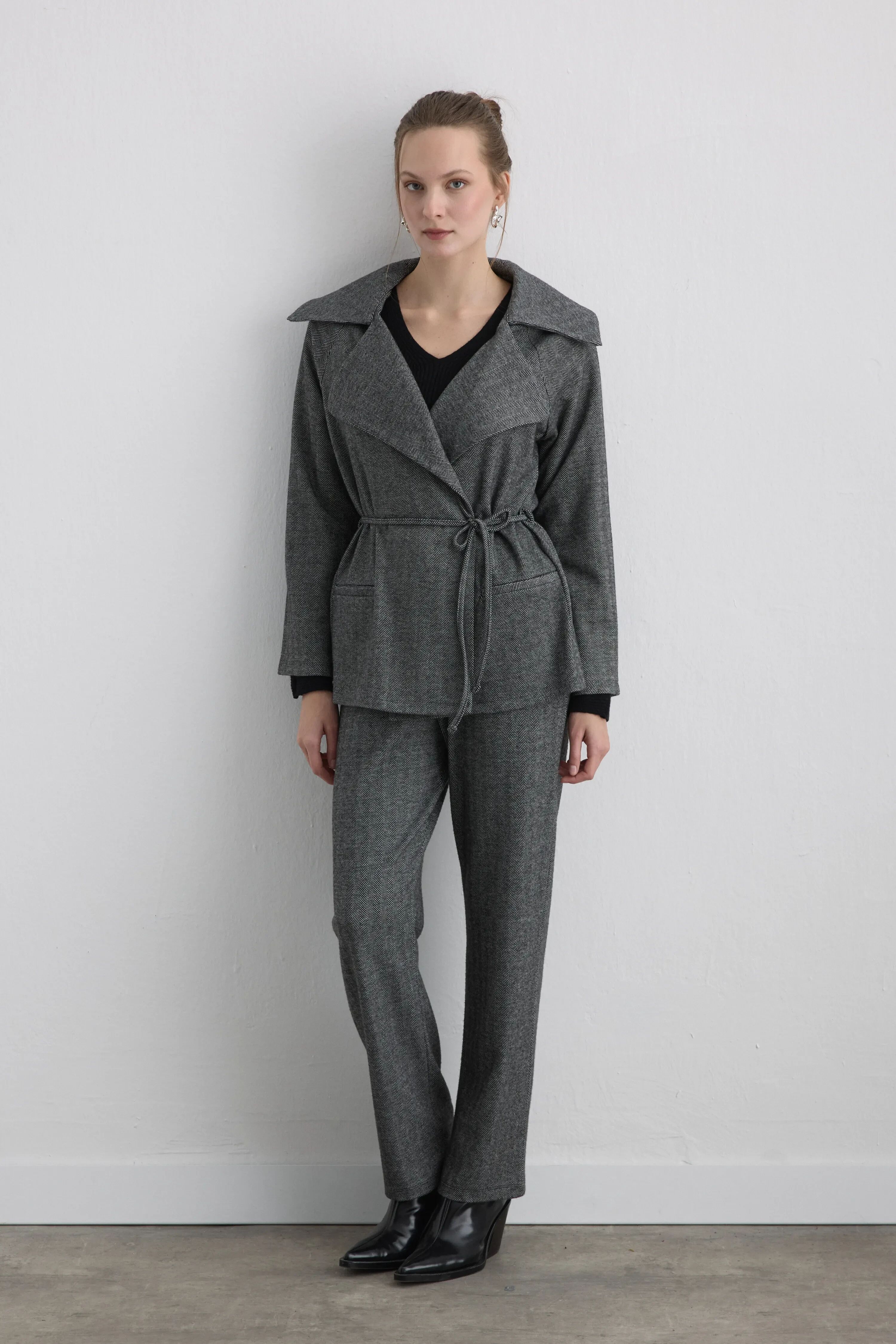 Beli Bağcıklı Balıksırtı Ceket & Havuç Pantolon - Gri Takım