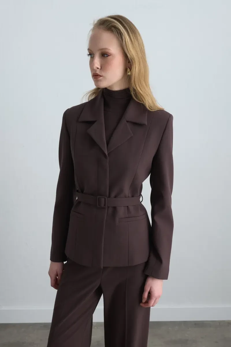 Klasik blazer formunu modern kemer detayıyla buluşturan bu ceket, vücut hatlarını zarifçe öne çıkarır. Kahverengi tonu, her mevsim farklı parçalarla uyum sağlayarak çok yönlü bir kullanım sunar. Ofis şıklığından davet stiline kadar geniş bir kullanım alanı yaratır. Şık pantolonlar ya da eteklerle kolayca kombinlenebilir.