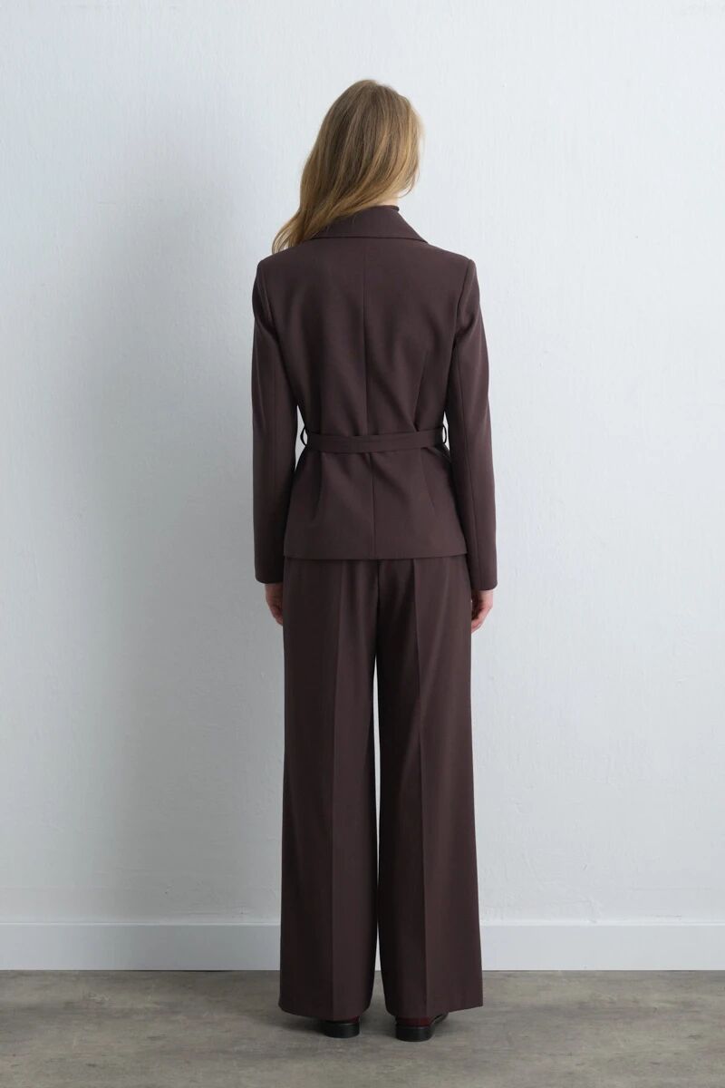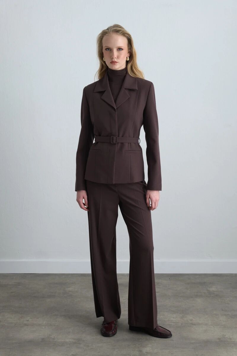 Beli Kemerli Blazer Ceket & Yüksek Bel Palazzo Pantolon - Kahverengi Takım